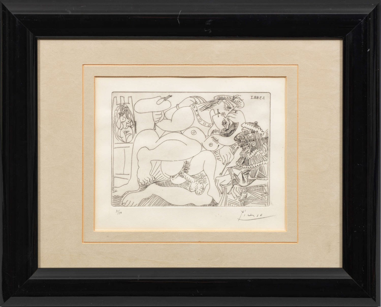 Radierung/Papier, 1968. Blatt 308 aus der Serie 347, die Picasso von März bis Oktober 1968 erschaffen hat. Im Laufe von 204 Tagen entstanden die insgesamt 347 Motive der Suite, die seinen bis ins Alter ungebrochenen, fieberhaften Schöpferdrang vor Augen stellen. Zur Durchführung des Mammutprojekts hatten die Drucker Aldo und Piero Crommelynck eigens in einer alten Backstube nahe beim Atelier des Künstlers in Mougins eine Druckerei eingerichtet. So konnte Picasso den Druck fortlaufend überwachen. Eine ganze Folge von Arbeiten innerhalb der 347er Serie widmet sich der intimen Beziehung zwischen Raffael und Fornarina, welche hier vom Papst beobachtet werden. Druck Aldo und Piero Crommelynck. Herausgegeben von der Galerie Louise Leiris, Paris, 1969, in einer nummerierten Auflage von 50. Sign. und nummeriert 31/50. Plattenmaß 14,6 cm x 20,2 cm. Passepartoutausschnitt 19,5 cm x 24 cm. Rahmen.