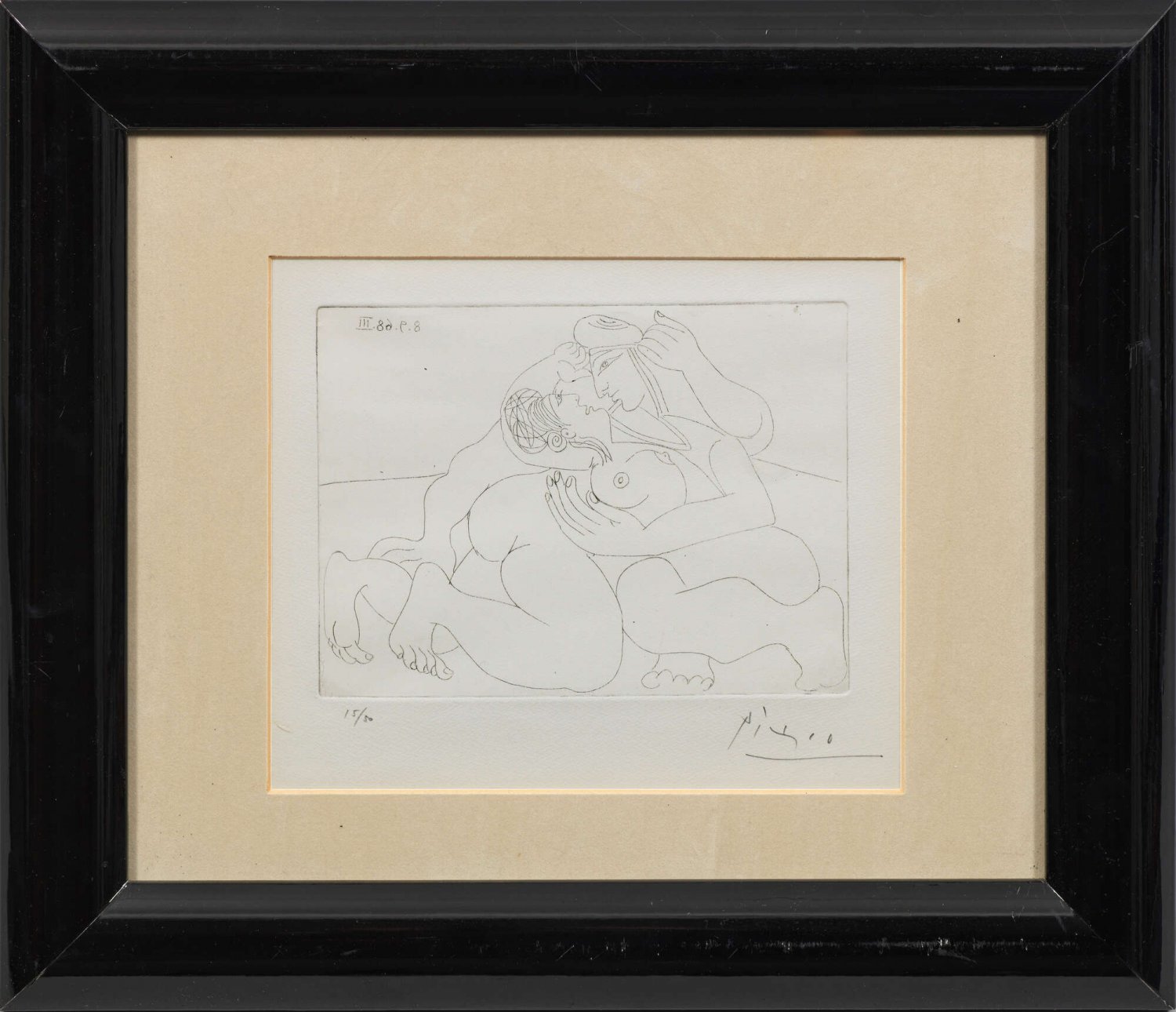 Radierung/Velin, 1968. Aus der Serie 347, die Picasso von März bis Oktober 1968 erschaffen hat. Im Laufe von 204 Tagen entstanden die insgesamt 347 Motive der Suite, die seinen bis ins Alter ungebrochenen, fieberhaften Schöpferdrang vor Augen stellen. Zur Durchführung des Mammutprojekts hatten die Drucker Aldo und Piero Crommelynck eigens in einer alten Backstube nahe beim Atelier des Künstlers in Mougins eine Druckerei eingerichtet. So konnte Picasso den Druck fortlaufend überwachen. Druck Aldo und Piero Crommelynck. Herausgegeben von der Galerie Louise Leiris, Paris, 1969, in einer Auflage von 50. Sign. und nummeriert 15/50. Plattenmaß 14,8 cm x 20 cm. Passepartoutausschnitt 20,5 cm x 24 cm. Rahmen.