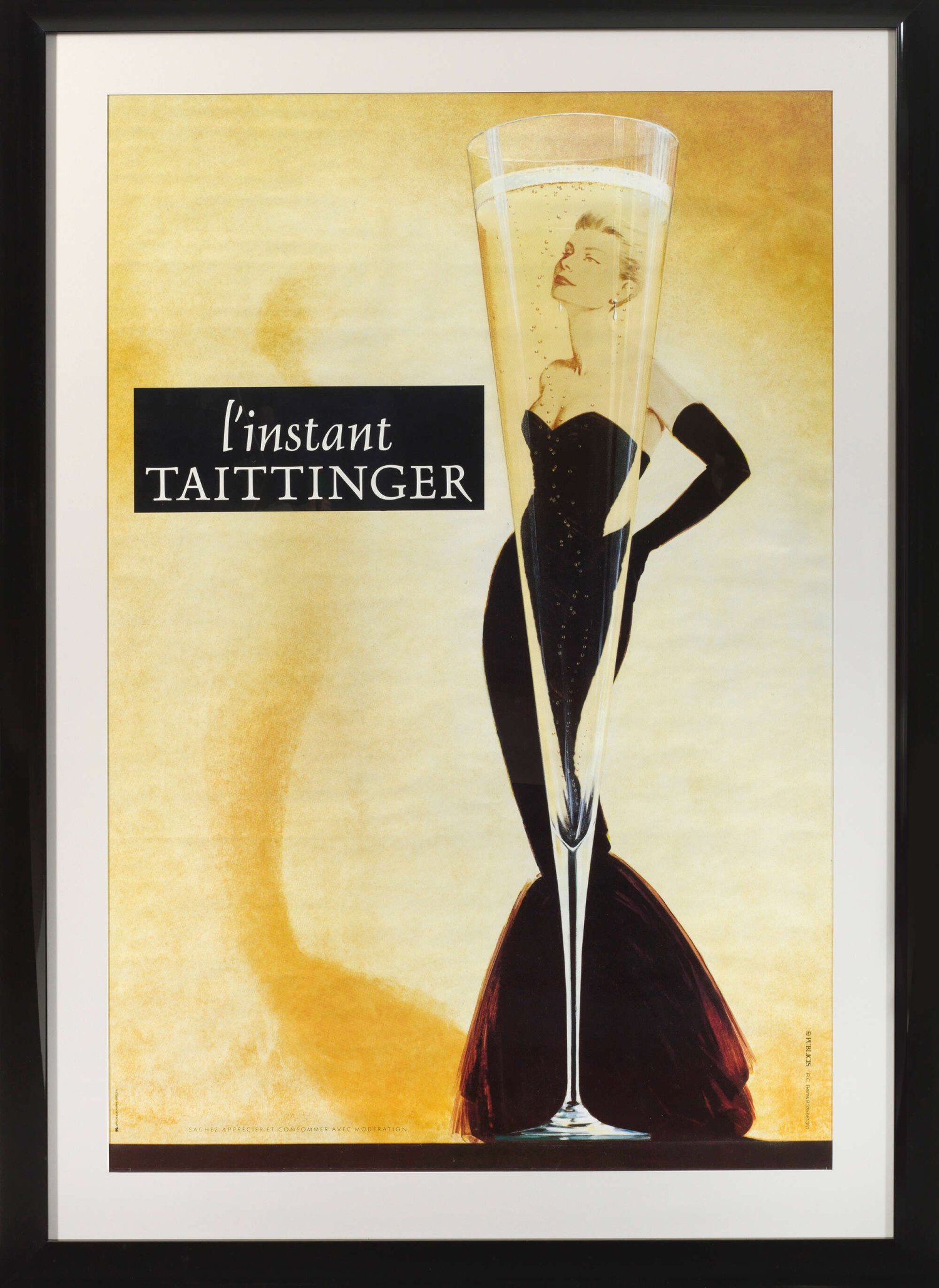 Goßes Werbeplakat "l'instant TAITTINGER" mit Grace Kelly Farboffsetlithographie/Papier, nach 1988. Im Druck betitelt u. typographisch bez."SACHEZ APPRECIER ET CONSOMMER AVEC MODÉRATION", "PUBLICIS R.C. Reims B335581351" und "AFFICHE EUROPEENNE 47902376". 1988 kreierte die berühmte Champagner-Firma unter der Führung von Claude Taittinger eine einzigartige, erfolgreiche Marketingkampagne, die zum Synonym für die Luxusmarke wurde. Patrick Arlet gestaltete das zugehörige Werbeplakat "l'instant TAITTINGER" mit der höchst eleganten, stilvollen Figur von Grace Kelly (1929 - 1982) in langem, schwarzem Kleid hinter einem gefüllten Champagnerglas. Das sinnliche Poster im Stil der 1950er Jahre mit dem Hollywood-Filmstar (der späteren Prinzessin von Monaco) wurde sofort zu einem ikonischen Klassiker und erweckte zugleich Neugierde auf die Marke. 168 cm x 114,5 cm (Passepartoutausschnitt). Rahmen.