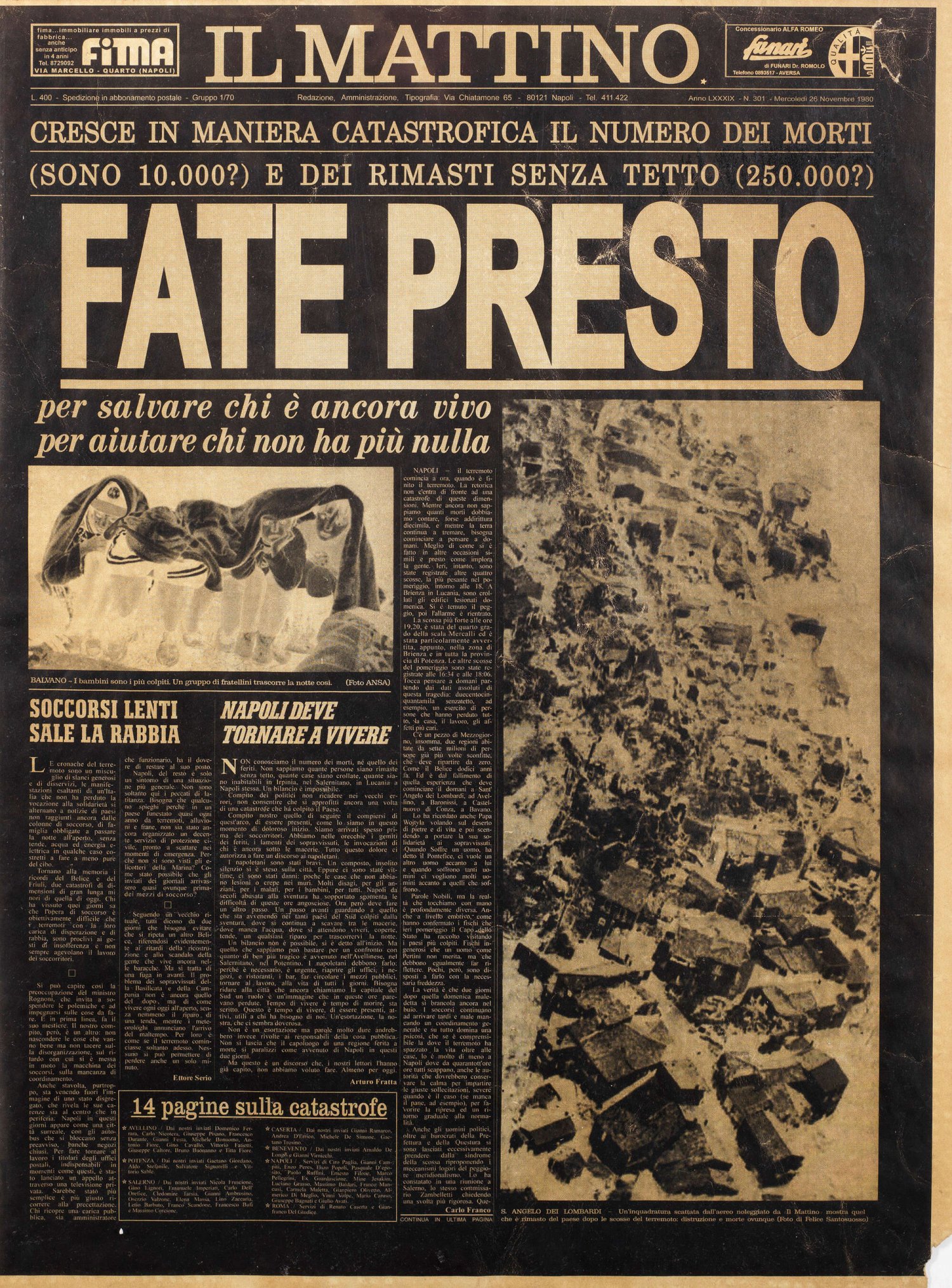 Fotosiebdruck/Papier, 1980. Titelseite der italienischen Tageszeitung Il Mattino, welche das Erdbebenunglück in der Region Irpinia meldet. Minim. gewellt, kleine Fehlstelle. Verso mit Signaturstempel. Darstellung 58 cm x 44 cm.