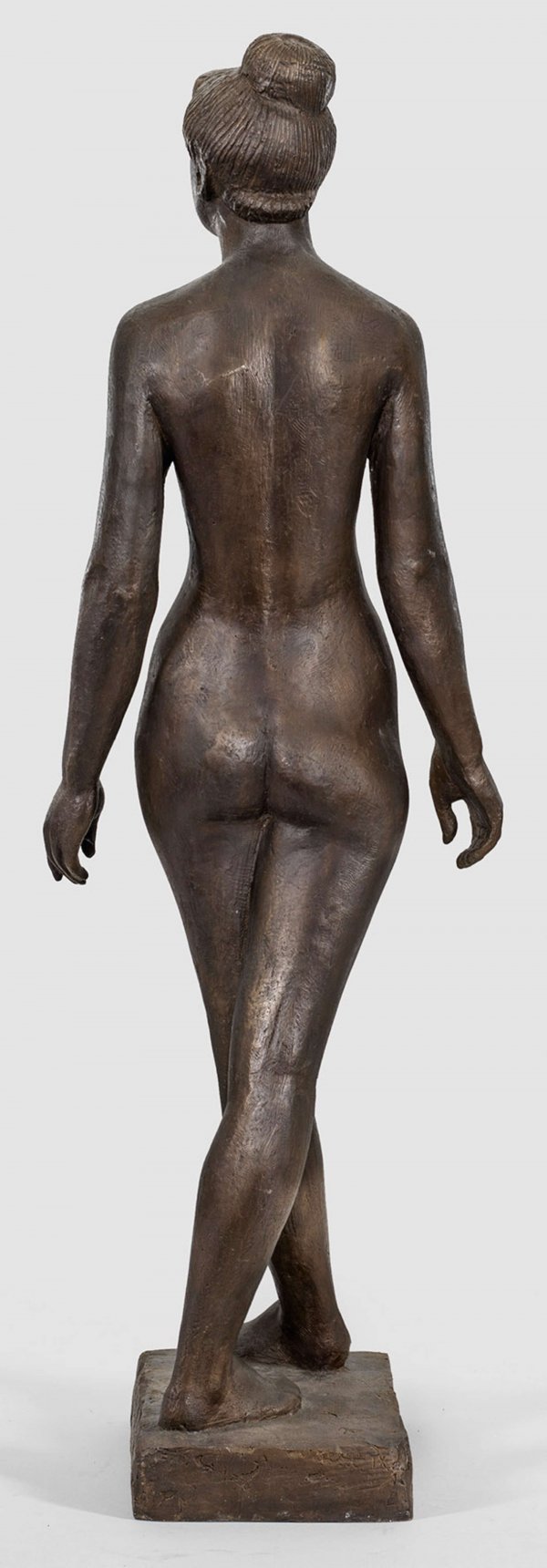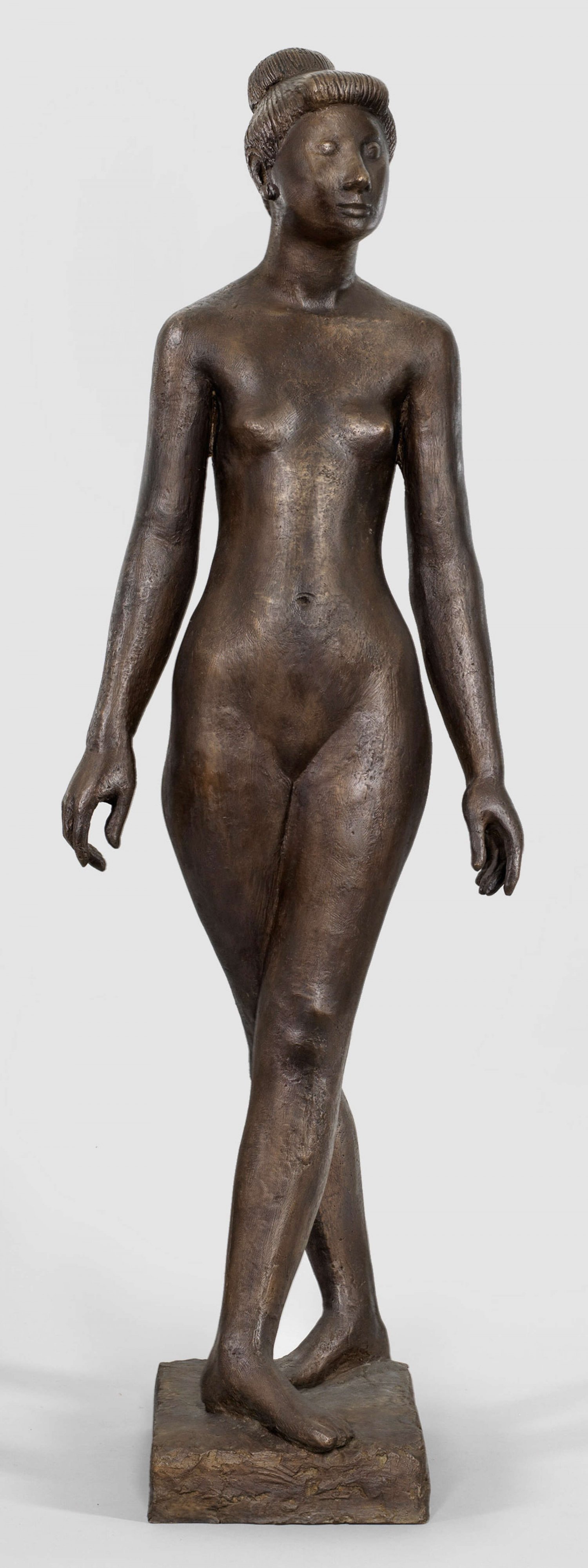 Bronze, dunkelbraun patiniert, 1947. Künstlersignet ("Phoenix"), nummeriert "IX". Gießerstempel "GUSS BARTH RINTELN". Guss nach 1970. Wvz. Rudloff 499. Auf einer rechteckigen Plinthe stehende Aktfigur einer jungen Tänzerin mit hochgestecktem Haar in graziöser, energievoller, aufrechter Pose, den linken Fuß diagonal vor den Rechten setzend. Das Motiv der Tänzerin und die tänzerische Pose der winkelig voreinander gestellten Füße beschäftigten den Bildhauer bereits 1930/31 in seiner Zeit an der Kunstschule Burg Giebichenstein in Halle an der Saale wie eine in der Haltung vergleichbare Bronze (Wvz. 224) von 1931 und eine vorbereitende Zeichnung in der Sammlung des Gerhard Marcks-Hauses in Bremen zeigen. Marcks wirkte 1919-1924 als Meister am Bauhaus, 1933 verlor er sein Lehramt an der Burg Giebichenstein; seine Werke wurden in der Zeit des Nationalsozialismus teilweise als "entartet" verfemt. 1945 wurde Marcks an die Landeskunstschule Hamburg berufen, ab 1950 arbeitete er freischaffend in Köln und in der Eifel. Diese in der Hamburger Zeit modellierte Plastik einer "Tänzerin" ist charakteristisch für das Oeuvre des bedeutenden deutschen Bildhauers der Klassischen Moderne. Seine stehenden, liegenden oder sitzenden, in auf das Wesentliche der Form und des Ausdrucks komprimierten Aktfiguren zeigen Mädchen bzw. junge Frauen in ihren natürlichen Bewegungen und Haltungen; nie wirken seine stilisierten Figuren heroisch oder pathetisch, sie spiegeln stattdessen in überzeitlicher Weise allgemeine menschliche Grundstimmungen, zuweilen auch eine gewisse Verhaltenheit wider. H. 108 cm.