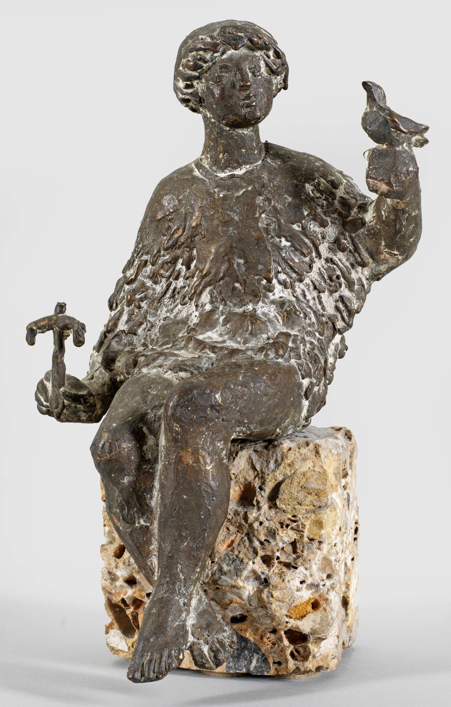 Bronze, braun patiniert, 1966. Steinsockel. Wvz. Neubauer 196605. Auf einem Felsen sitzender "Papageno" mit Vogel und Glockenspiel in den Händen. In moderner Weise stilisierte, plastische Umsetzung der berühmten Vogelfänger-Figur aus der Mozart-Oper "Die Zauberflöte". Die seit 1936 in München ansässige, an der Akademie ausgebildete und mehrfach ausgezeichnete Bildhauerin stellte 1949-1989 regelmäßig im Haus der Kunst aus und war 1987 Ehrengast in der Villa Massimo in Rom. Ger. besch.; Ges.-H. 31 cm.
