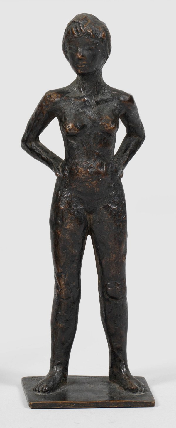 Bronze, dunkel patiniert. Ligatur-Monogr.; Jaekels Oeuvre als Bildhauer der Klassischen Moderne basierte auf seinem Studium an den Kölner Werkschulen (1924-1929) als Meisterschüler von Hans Wissel; 1947 übernahm er die Leitung der dortigen Klasse für Metallbildhauerei und wurde seit den 1950er Jahren insbesondere durch Arbeiten im öffentlichen Raum bekannt. H. 22 cm.