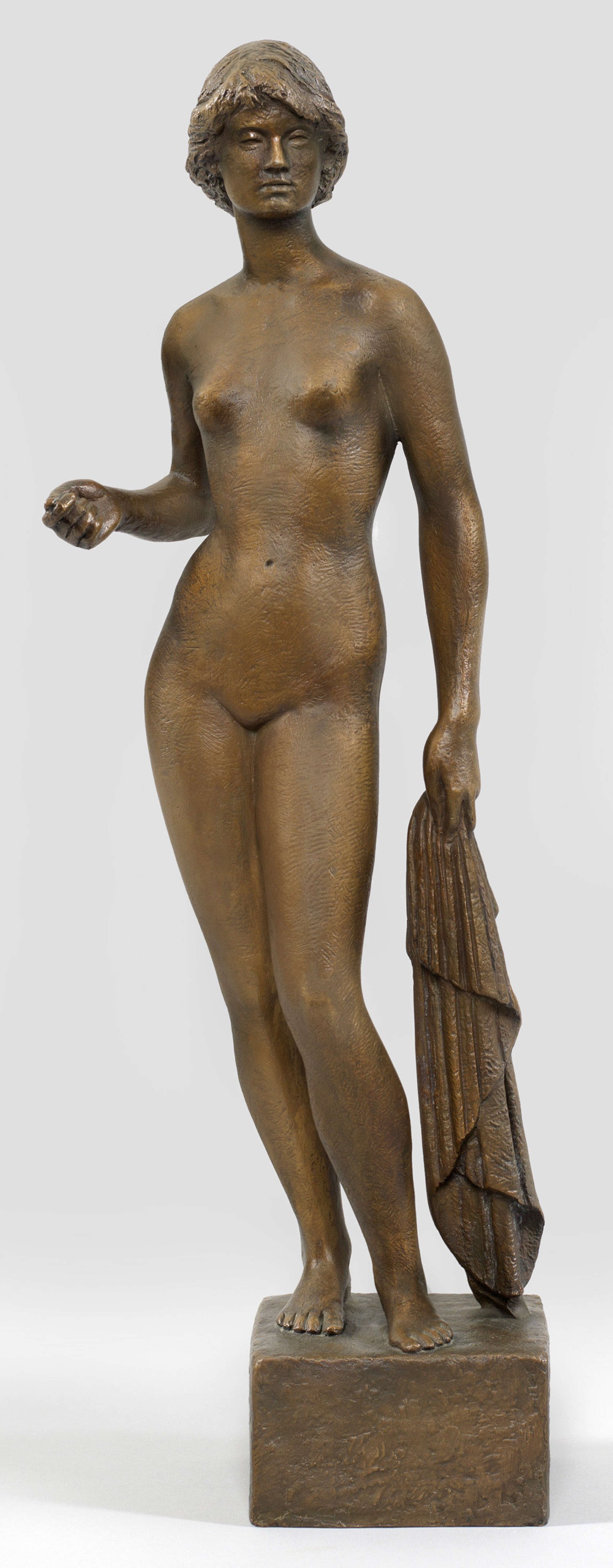 Bronze, dunkelbraun patiniert, 1990. Sign. u. dat. 1990. Gießerstempel "GUSS STREHLE", nummeriert "RAC 1991 5/349". Harmonisch gestaltete, weibliche Aktstatuette des 1936-1943 an der Münchener Akademie bei Joseph Wackerle, Ernst Buschor und Hans Jantzen ausgebildeten Bildhauers. H. 59 cm.