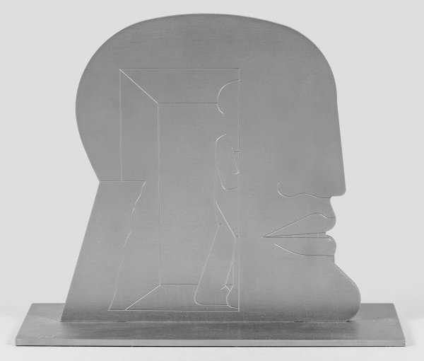 Edelstahl. Sign. u. nummeriert 41/65. Für die Unicef in einer Sonderedition geschaffene Arbeit des Künstlers. Die auf einer Rechteckplinthe montierte Platte mit stilisiertem Profilkopf verbindet das Kopfmotiv durch eine feine Linienzeichnung mit einem Mann, der ein Haus betritt. Formal reduzierte, monolithisch wirkende, sog. "Kopffüßler" und maskenhafte Profilköpfe sind seit 1962/63 zentrale Motive seines Oeuvres: "Im Kopf kann alles passieren, aber der Kopf schützt auch den Menschen. Es gibt offene, bewohnbare Köpfe. Der ganze Mensch ist im Kopf enthalten. Und es gibt den leeren Kopf, der alles aufnehmen kann und wieder alles abgibt." (Zit. H. Antes in: "Horst Antes", Ausstellungs-Kat. Hannover u. Bremen, S. 26). Antes nahm 1964, 1968 und 1977 an den documenta-Ausstellungen in Kassel teil, 2013 fand eine große Retrospektive im Berliner Martin-Gropius-Bau statt. 28,5 cm x 34 cm x 10 cm.