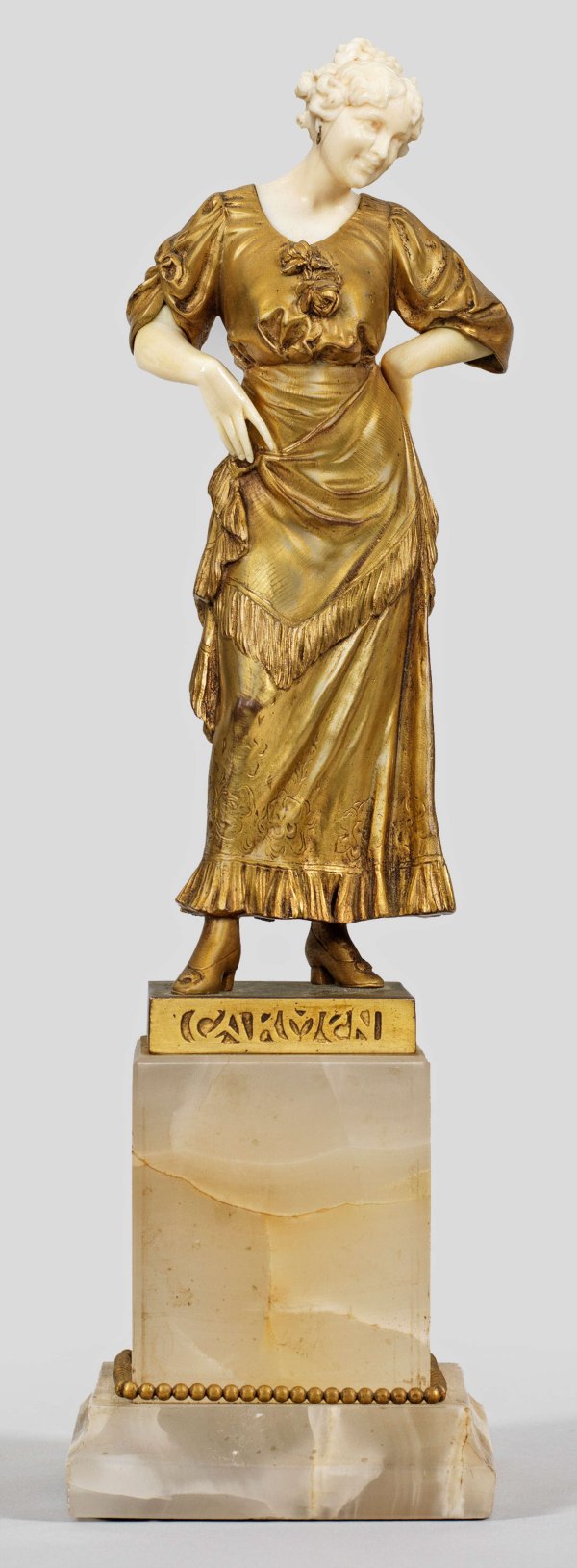 Bronze, vergoldet, Elfenbein, geschnitzt. Heller Oynxsockel. Auf der Plinthe sign. "Preiß fec.(it)", betitelt sowie Gießer-Inschrift "AKT=Ges.-GLADENBECK=BERLIN". Auf einer rechteckigen Plinthe in selbstbewusster Pose stehende Carmen mit hochgestecktem, von einem Kamm gehaltenen Haar und Creolen als Ohrschmuck, die linke Hand in die Taille gestützt und den rechten Fuß vorgesetzt; gewandet in ein blütenverziertes, spanisches Kleid mit gerafften Ärmeln und Fransen. Sehr fein geschnitzte und ziselierte Jugendstil-Chryselephantinstatuette als virtuose bildnerische Umsetzung der berühmten Figur aus der Oper von Georges Bizet. Der bedeutende Elfenbeinschnitzer und Bildhauer Ferdinand Preiss gründete 1906/07 die Firma "Preiss & Kassler" in Berlin, ab 1910 entstanden erste Chryselephantinfiguren in Zusammenarbeit mit der dort ansässigen, renommierterten Gießerei Gladenbeck. Figuren-H. 20,2 cm; Ges.-H. 29 cm.