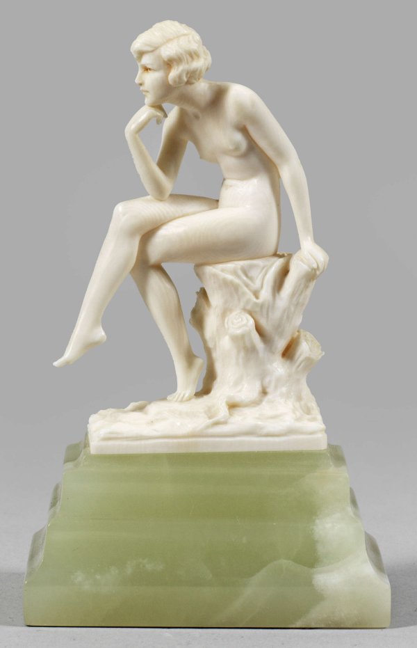 Elfenbein, fein geschnitzt; grüner Onyxsockel. Sign.; Auf einem Baumstamm sitzender Akt in sinnierender Pose. Um 1930 ausgeführte Figur des bedeutenden Bildhauers und Elfenbeinschnitzers. Nach seiner Ausbildung in Erbach und Studienreisen (u. a. nach Paris) gründete er 1906/07 in Berlin die von ihm künstlerisch geleitete Werkstätte "Preiss & Kassler", die sich mit Ihren Jugendstil- und Art Déco-Figuren einen internationalen Ruf erwarb und diese auch nach England und in die USA verkaufte. H. 10,8 cm.