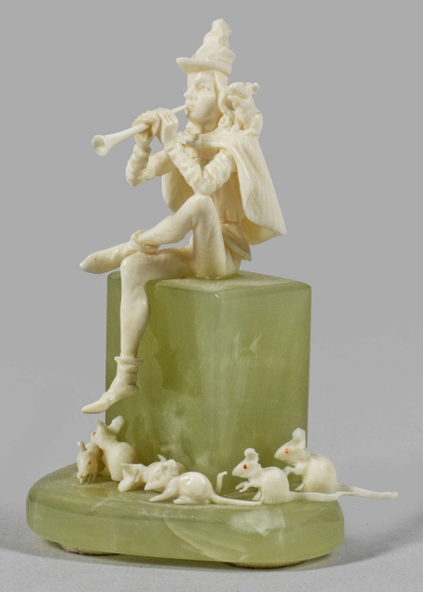 5-tlg. Gruppe. Elfenbein, fein geschnitzt; grüner Onyxsockel. Höchst filigran und detailreich geschnitzte Figur des Flöte spielenden, sitzenden Rattenfängers von Hameln, zu dessen Füßen zwei Ratten sitzen; vier gesonderte Tiere sind frei komponierbar. Der Erbacher Elfenbeinschnitzer arbeitete u. a. für Ferdinand Preiss. H. 7,8 cm.