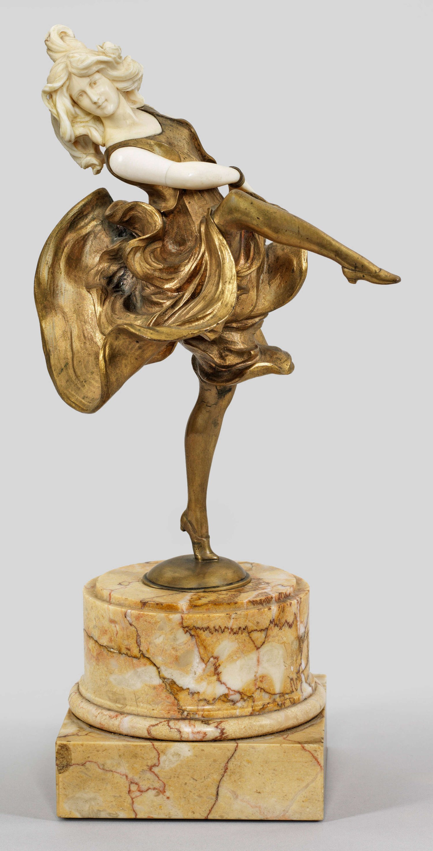 Bronze, vergoldet; Elfenbein, geschnitzt; ockerfarbener Marmorsockel. Sign.; Im Jahr 1900 von Emil Kiemlen modellierte, vollplastische Jugendstil-Chryselphantinfigur mit einer Darstellung der berühmten australischen Cancan-Tänzerin Saharet (1878 - 1964) bei einem ihrer kühnen Tänze mit beschwingter Pose und wirbelndem Kleid. Im lebendigen, tänzerischen Ausdruck meisterhafte, fein ausgeführte, frühe Statuette des Bildhauers, der 1891-1894 bei Adolf von Donndorf an der Stuttgarter Kunstakademie und 1897 an der Académie Julian in Paris bei Denys Puech studierte. Kiemlen dürfte Saharet bereits 1897 in Paris gesehen haben, als sie in den Folies Bergère auftrat. Auf der Pariser Weltausstellung 1900 war Kiemlen mit fünf Werken vertreten, auch im Münchener Glaspalast (1900) und auf der Großen Berliner Kunstausstellung (1901) zeigte er seine "Saharet"-Statuette. Ges.-H. 34,5 cm.