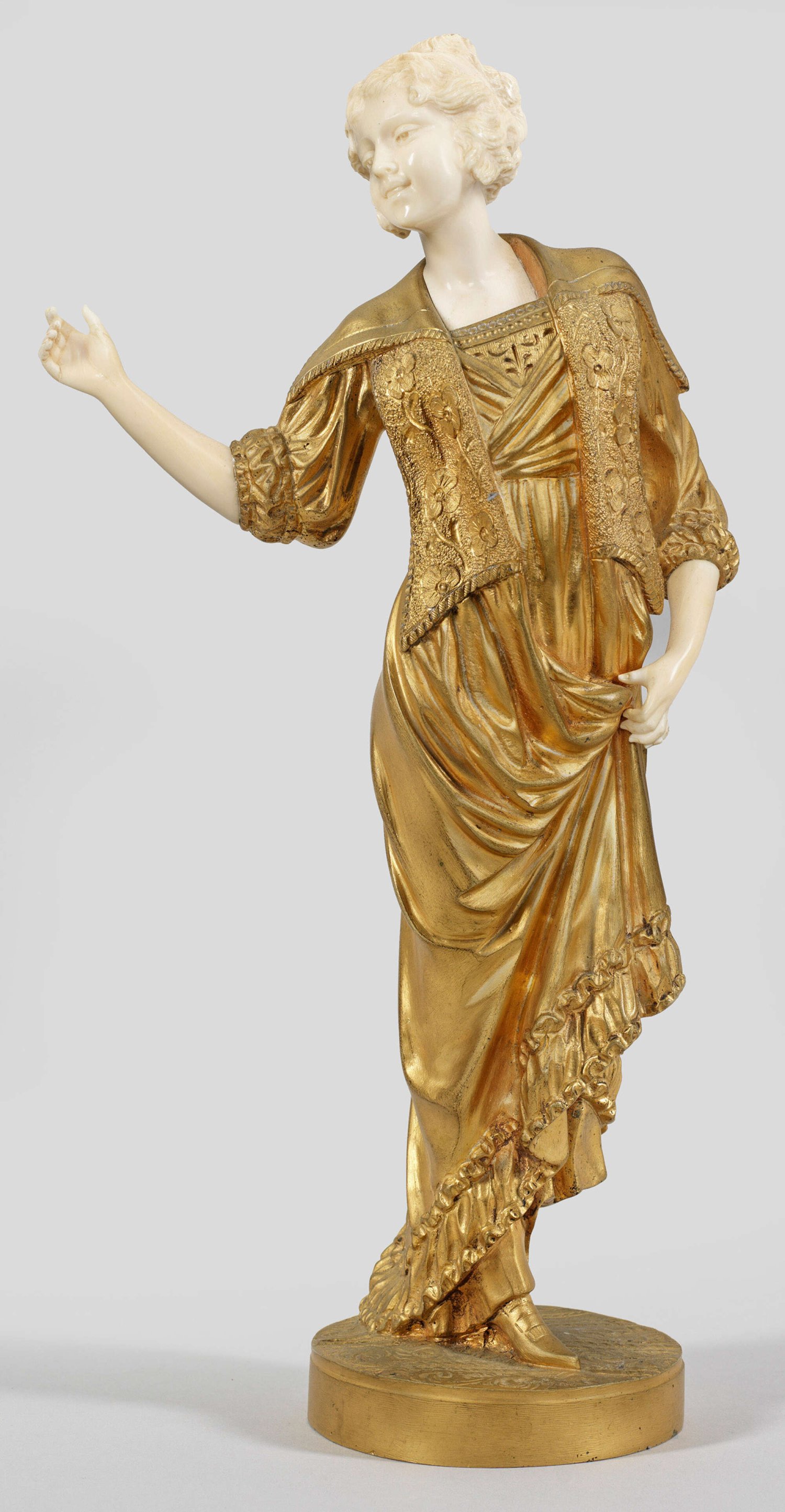 Bronze, vergoldet; Elfenbein geschnitzt. Sign.; Im Detail fein geschnitzte und ziselierte Figur des auf Chryselephantinfiguren spezialisierten Bildhauers. Somme war seit 1899 mit Werken auf dem Salon des Artistes Français in Paris vertreten; 1924/25 auf dem Salon sowie auf der Weltausstellung 1937 in Paris wurde er mit Silber- bzw. Goldmedaillen ausgezeichnet. H. 36 cm.