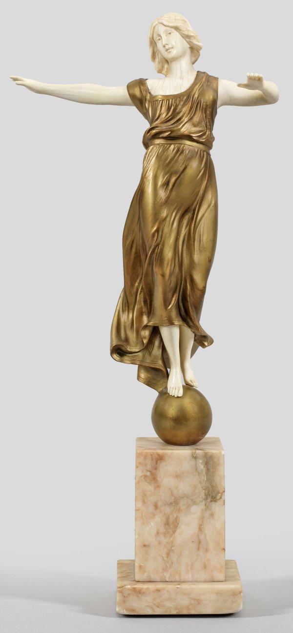 Vergoldete und kalt patinierte Bronze; Elfenbein geschnitzt. Alabastersockel. Sign.; Graziös auf einer Kugel balancierende, junge Frau in einem leichten, bewegt fließenden, langen Kleid, die Arme erhoben. Elegante, künstlerisch herausragende Jugendstil-Chryselphantinfigur des Bildhauers. Sockel ger. best.; Ges.-H. 39,2 cm.