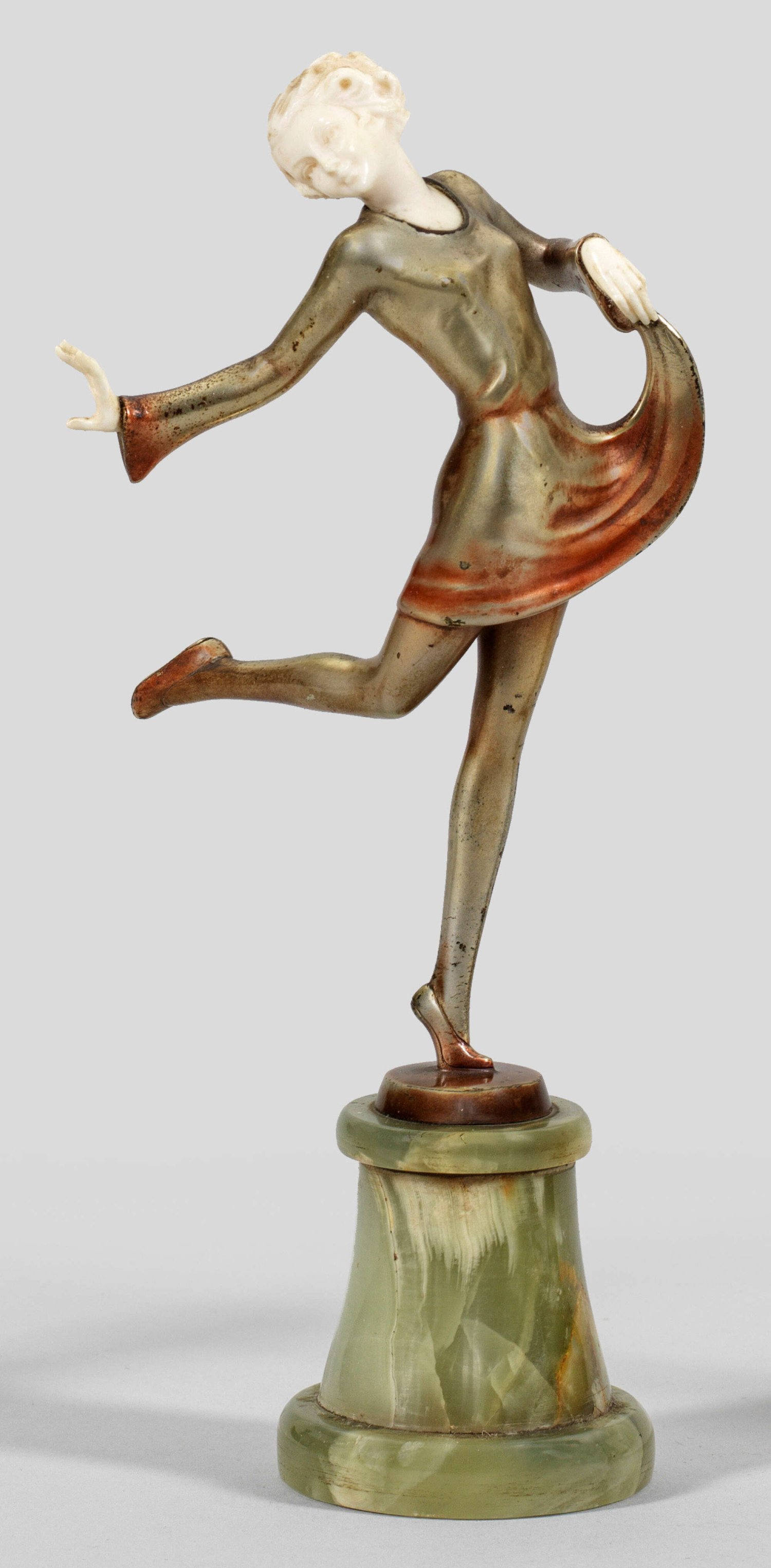 Bronze, gold- bzw. silberfarbene und rote Kaltpatinierung; Elfenbein, geschnitzt. Hellgrüner Onyxsockel. Sign. "Renz". Vollplastische Darstellung einer beschwingten, auf einer Fußspitze stehenden Tänzerin in kurzem, mit der linken Hand angehobenem Kleid. Die um 1925-1930 entstandene Art Déco-Statuette gehört zu einer umfangreichen Werkgruppe Lorenzls, der mit Vorliebe junge Tänzerinnen in höchst graziösen Posen darstellte. Ges.-H. 23 cm.