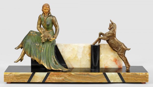 Figural group with an elegant lady and a goat. Cold painted metal cast with composition head, black marble and onyx. Signed.