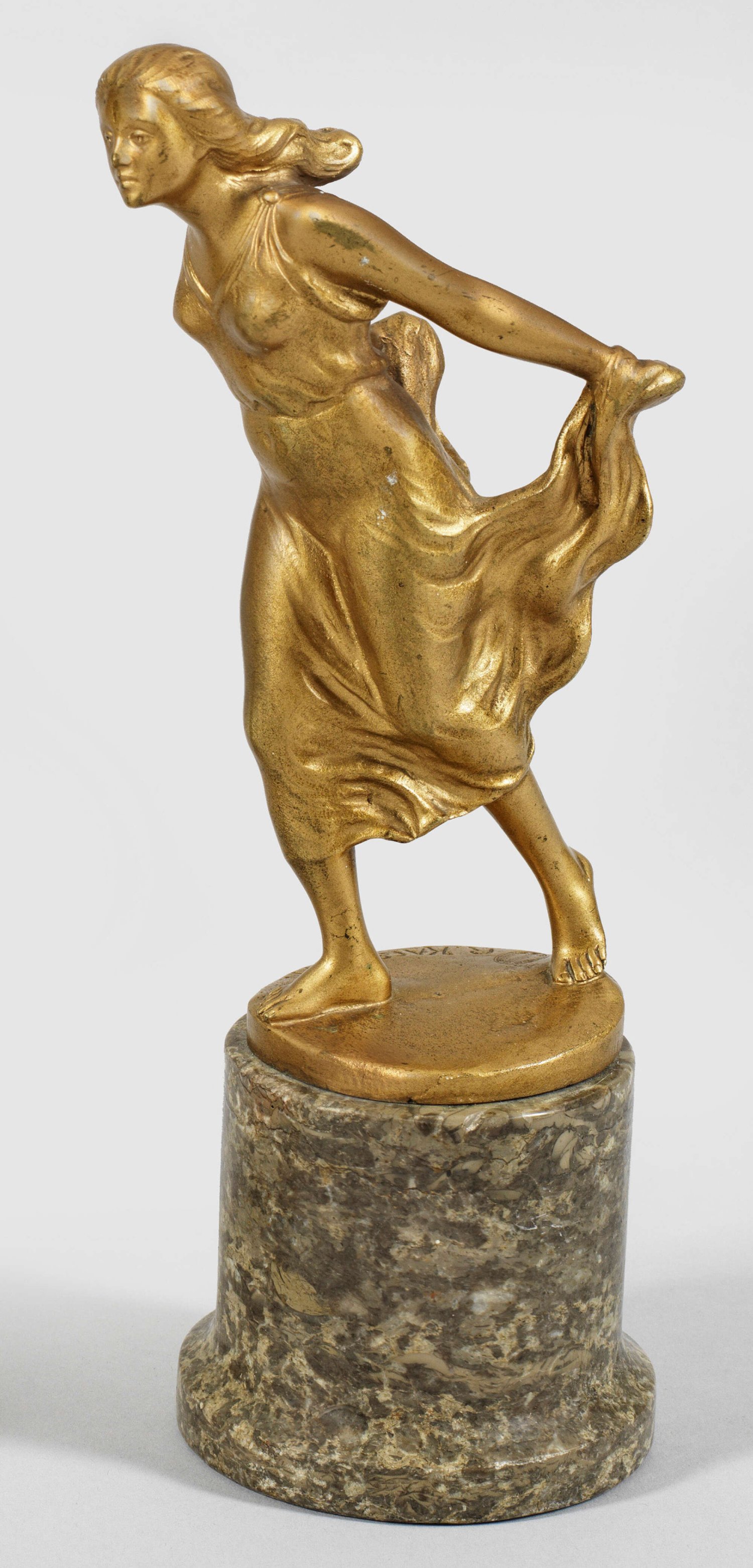 Bronze, goldfarbene Kaltpatinierung. Sign.; Ovaler Gießerstempel "ERNST KRAAS BILDGIESSEREI BERLIN S.O. 26". Graubrauner Marmorsockel. Der an den Akademien in Hanau, Paris und Brüssel ausgebildete, ab 1904 in Berlin tätige Bildhauer schuf neben lebensgroßen Marmorfiguren vornehmlich Bronzen mit Tänzerinnen und weiblichen Akten. Ges.-H. 24 cm.