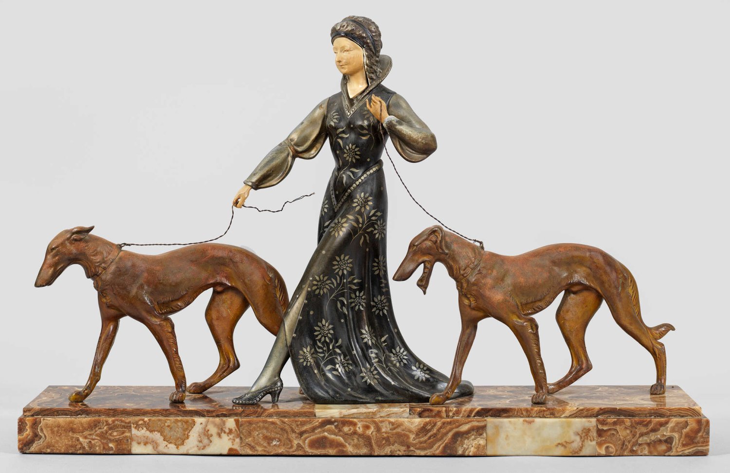 Figural group with an elegant lady and greyhounds. Cold painted metal cast, the lady with composition head and hands. Onyx base. Signed. Minor flaws.