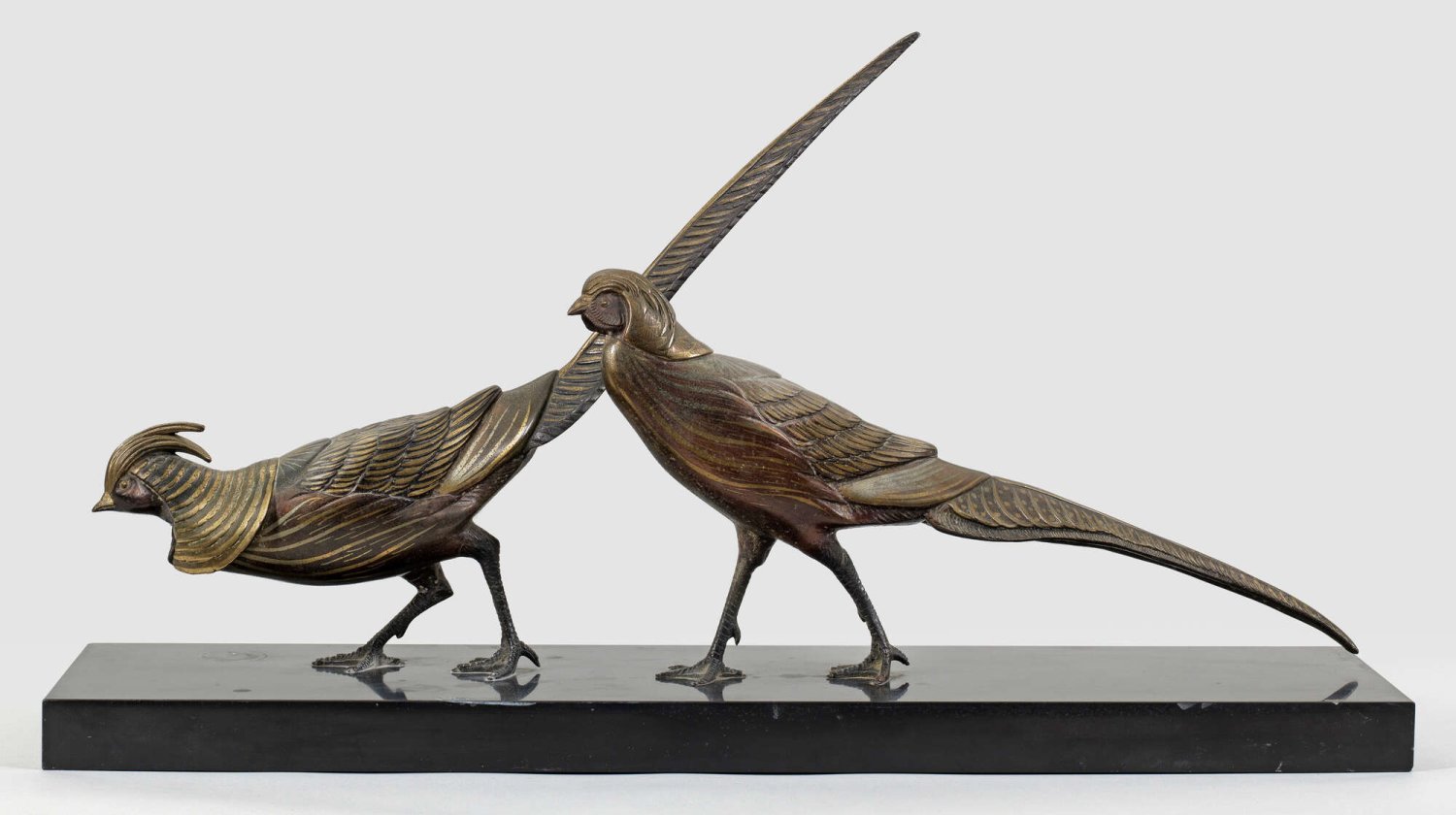 A large dark patinated and gilt Art Deco bronze group with two pheasants on black marble base. Signed. Minor chips to the base.