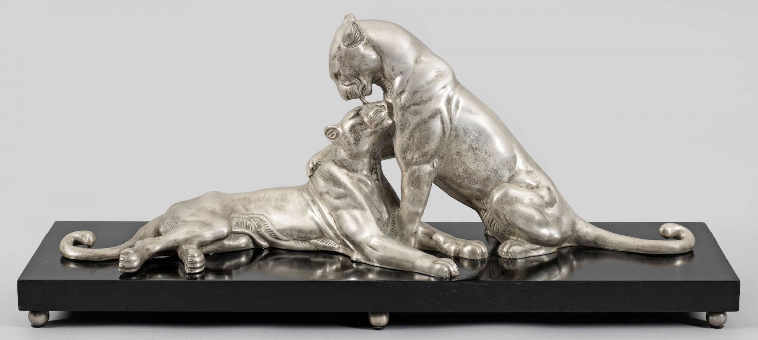 Metallguss. Ebonisierter Holzsockel. Vollplastische, stiltypische Darstellung eines liegenden Panthers, der von einem zweiten, sitzenden Panther liebevoll geleckt wird. Ges.-H. 34 cm x 83 cm x 23 cm.