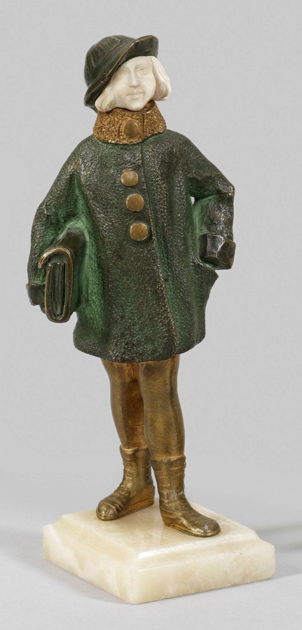 Bronze, teilw. vergoldet bzw. mit farbiger Kaltpatinierung, Elfenbein, geschnitzt. Onyxplinthe. Sign.; Vollplastische, von Chiparus beeinflusste Art Déco-Statuette eines eleganten Mädchens auf dem Schulweg. Ges.-H. 16,5 cm.