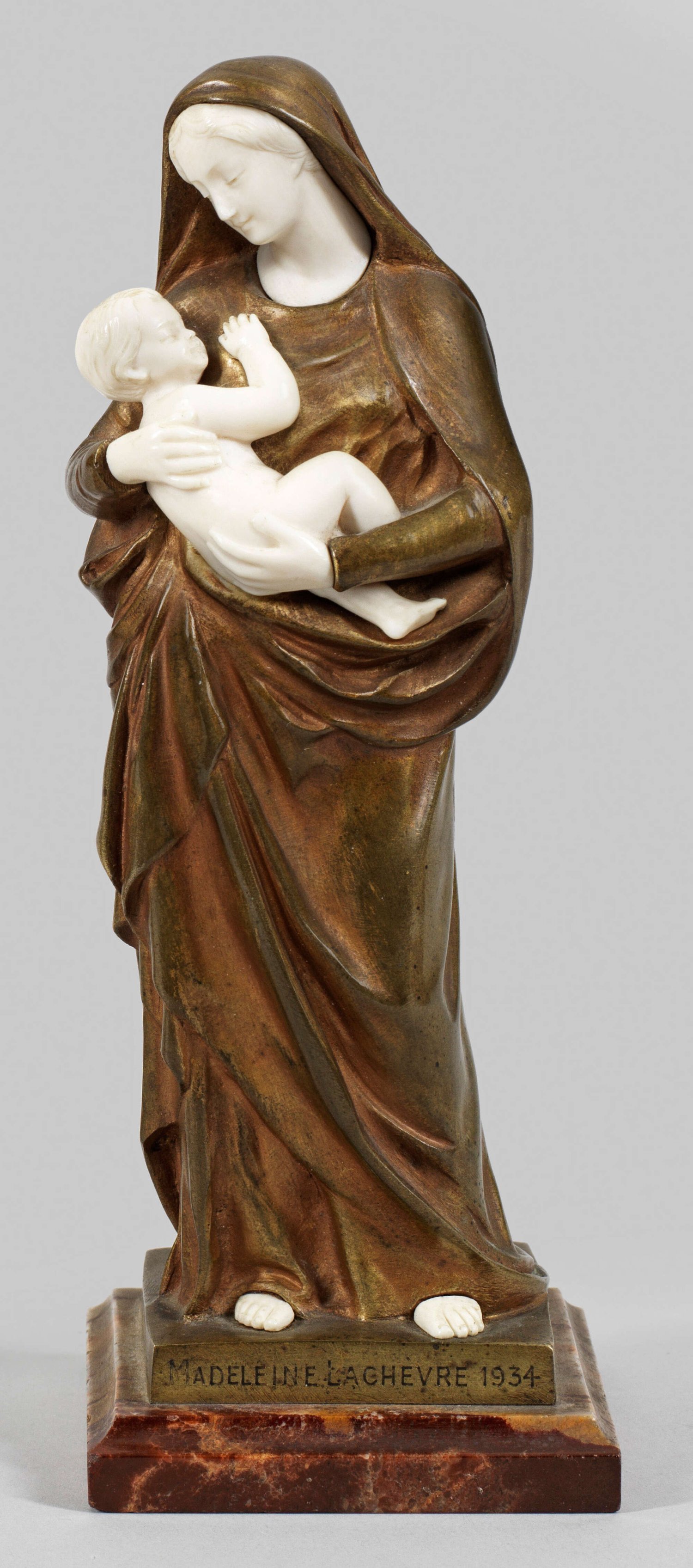 Bronze, goldbraun patiniert bzw. vergoldet; Elfenbein geschnitzt. Rötlich-grau geäderter Marmorsockel. Sign.; An der Plinthe Inschrift mit Dat. "OFFERT PAR LE BON PAPA EN SOUVENIER DE SA MÉMÉ MADELEINE LACHEVRE 1934". Harmonisch gestaltete Chryselephantin-Statuette mit subtilem Ausdruck von Innnerlichkeit. Morice stellte mehrfach im Salon aus, wo er 1910 und 1914 ausgezeichnet wurde; in den 1930er Jahren ließ sich der Bildhauer in Paris nieder. H. 21 cm.