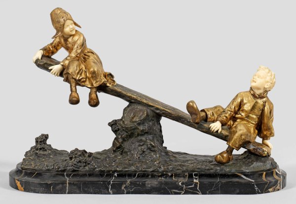 Bronze, dunkel patiniert und vergoldet; Elfenbein, geschnitzt.; Sign.; Schwarzer, weiß und ockerfarben geäderter Marmorsockel. Große, vollplastische Gruppe des italienisch-französischen Bildhauers, der um 1900 nach Paris ging und 1905 im Salon des Artistes Français ausstellte. In seinen Einzelfiguren und Gruppen, oft mit Kindern, schilderte er mit Vorliebe Szenen aus dem Land- und Volksleben. Eine dieser Gruppen mit Bauern und Kindern befindet sich in der Sammlung des Musée d'Orsay in Paris. Ges.-H. 31,5 cm; B. 49,5 cm.