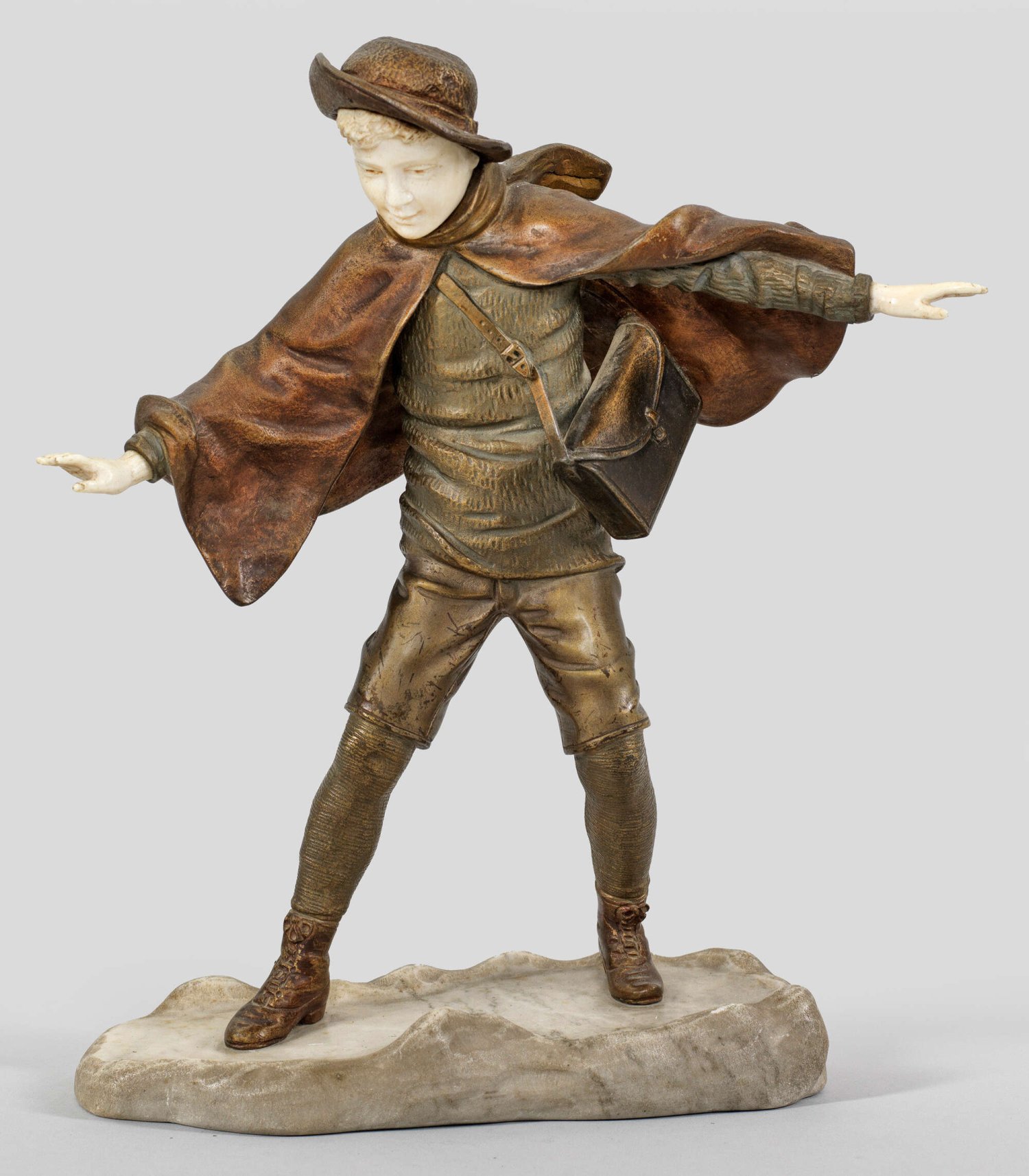 Bronze, in Gold- und Brauntönen kalt patiniert; Elfenbein, geschnitzt; Weißgraue Marmorplinthe. Sign. "O. Ruffony". In der lebendigen, situativen Wiedergabe des Knaben künstlerisch herausragende Figur des vielseitigen Schweizer Bildhauers, der aufgrund seiner Tätigkeit in Frankreich mit "Ruffony" signierte. H. 31 cm.