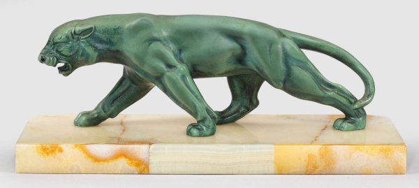 French Art Deco sculptor active circa 1925-1930. Metal cast figure of a panther on chalkstone and onyx base.