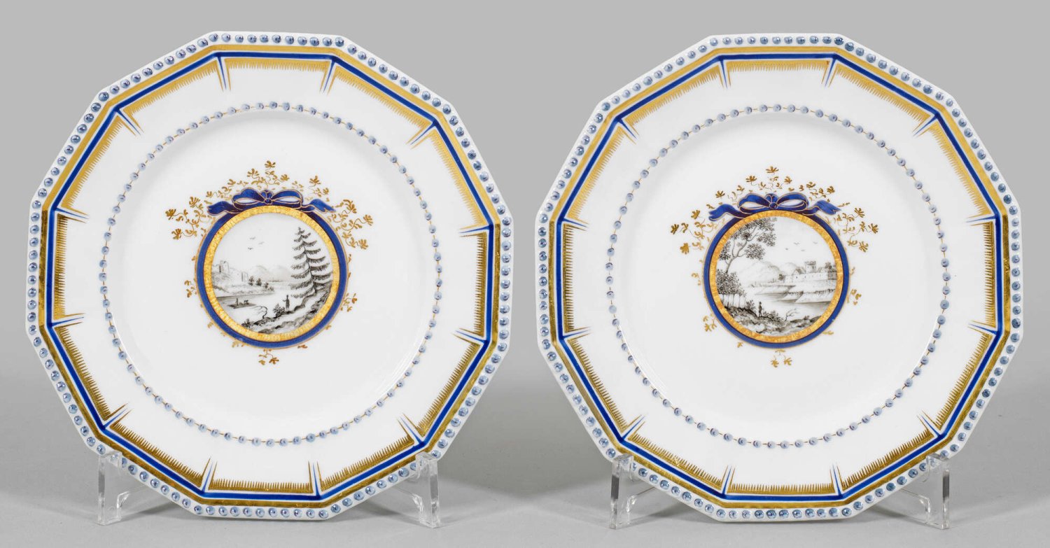 Paar Ansichtenteller aus dem sog. Bayerischen Königsservice Zwölfeckige Form mit reliefiertem Perlfries. Im leicht vertieften Spiegel medaillongerahmte Landschaft in Grisaillemalerei. Blau-goldener Randdekor. Manufakturmarke. D. 21 cm.