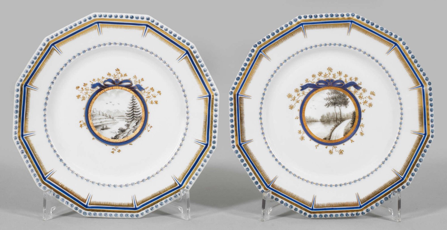 Paar Ansichtenteller aus dem sog. Bayerischen Königsservice Zwölfeckige Form mit reliefiertem Perlfries. Im leicht vertieften Spiegel medaillongerahmte Landschaft bzw. Ansicht des Englischen Gartens in München in Grisaillemalerei. Blau-goldener Randdekor. Manufakturmarke. D. 21 cm.