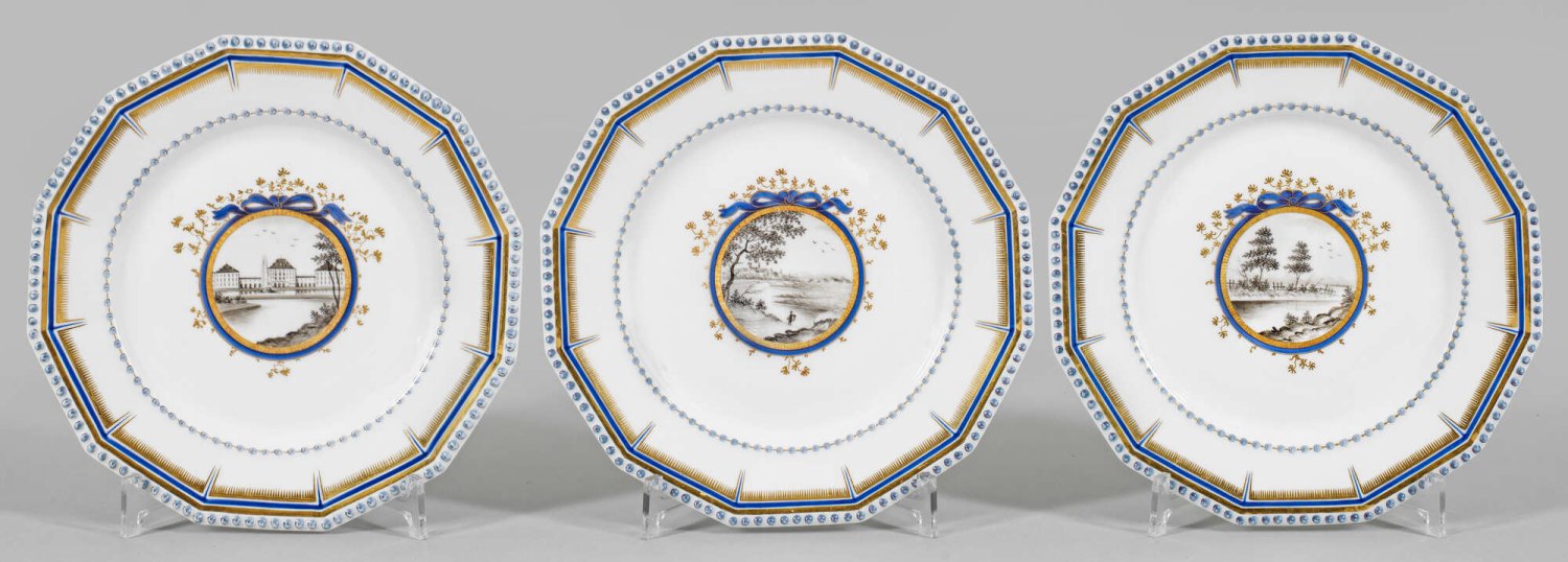 Drei Ansichtenteller aus dem sog. Bayerischen Königsservice Zwölfeckige Form mit reliefiertem Perlfries. Im leicht vertieften Spiegel medaillongerahmte Ansicht von Schloss Nymphenburg, des Isartals bei München sowie einer Landschaft in Grisaillemalerei. Blau-goldener Randdekor. Manufakturmarke. D. 24,5 cm.