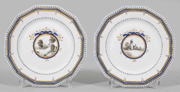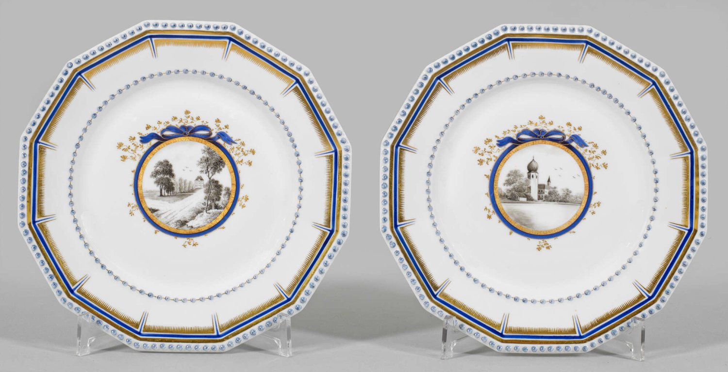 Paar Ansichtenteller aus dem sog. Bayerischen Königsservice Zwölfeckige Form mit reliefiertem Perlfries. Im leicht vertieften Spiegel medaillongerahmte Ansicht von Schloss Nymphenburg bzw. der Fraueninsel im Chiemsee in Grisaillemalerei. Blau-goldener Randdekor. Manufakturmarke. D. 24,5 cm.