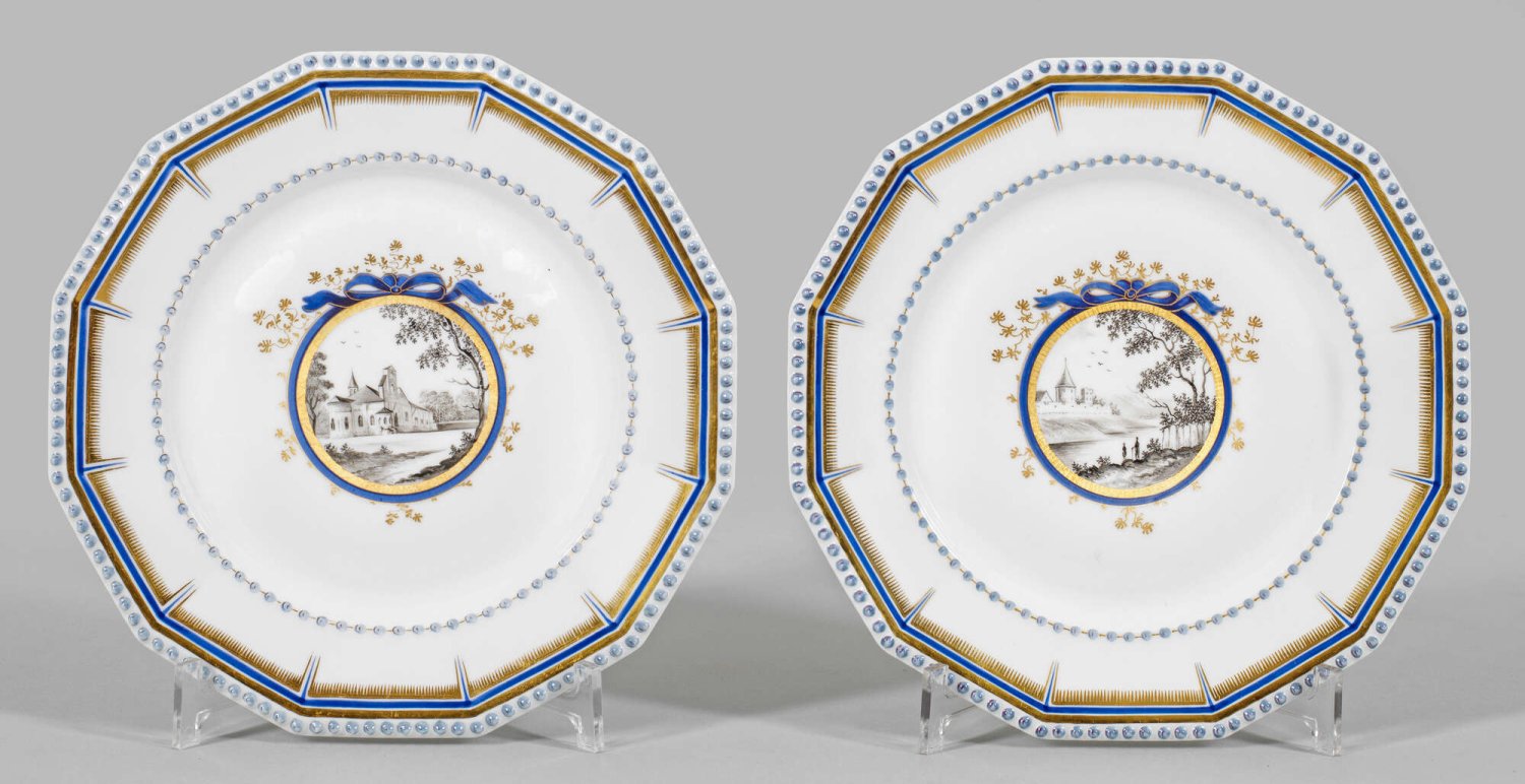 Paar Ansichtenteller aus dem sog. Bayerischen Königsservice Zwölfeckige Form mit reliefiertem Perlfries. Im leicht vertieften Spiegel medaillongerahmte Architekturlandschaft bzw. Ansicht der Magdalenenkapelle in Grisaillemalerei. Blau-goldener Randdekor. Manufakturmarke. D. 24,5 cm.
