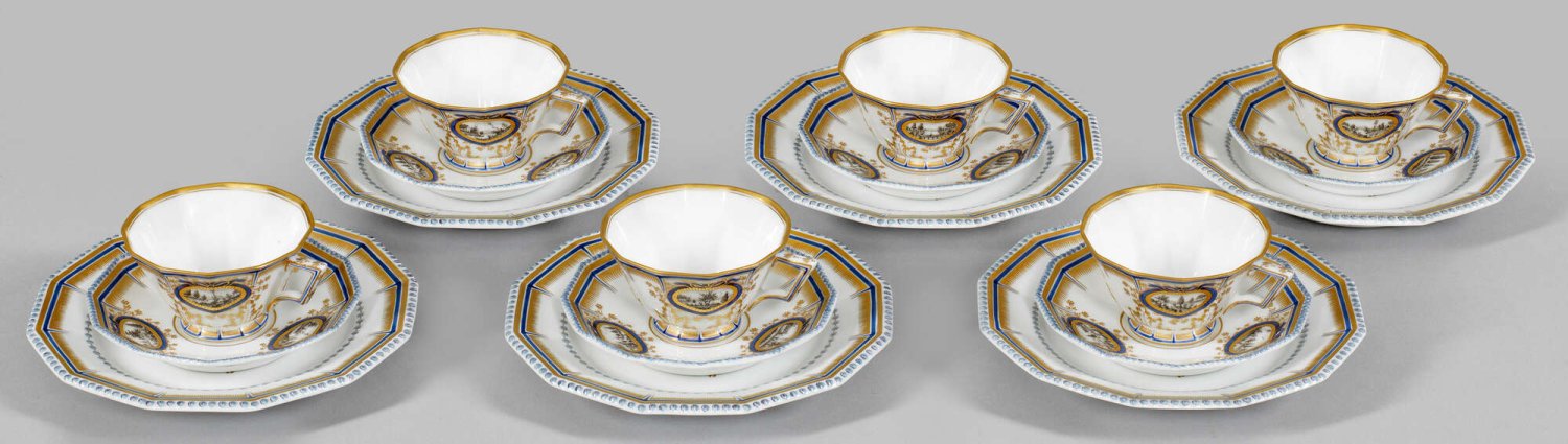 Sechs Mokka-Gedecke aus dem sog. Bayerischen Königsservice 12-tlg.; 6 Tassen mit Untertassen, 6 Dessertteller. Zwölfeckige bzw. konische, facettierte Form mit feiner, von blauschattierter Perlschnur umzogener, gold gestrichelter Randzone mit blauer Kontur. Teilw. umlaufende Akanthusblattreliefs. Auf der Wandung und im Spiegel goldradierte Schleifenmedaillons mit verschiedenen Landschaften bzw. Ansichten aus der Gegend um Dachau, Fürstenried, Schleißheim bzw. von der Isar in Grisaillemalerei. Entw. Dominikus Auliczek, um 1792 - 1795. Manufakturmarke. Tassen-H. 4,5 cm. Teller-D. 11 cm - 16 cm.
