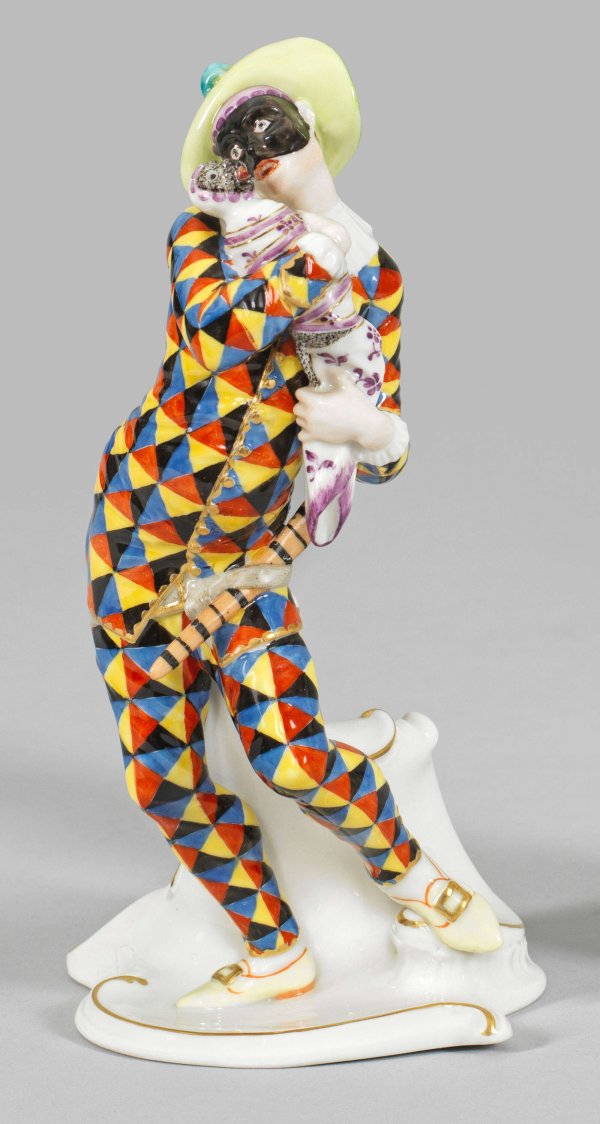 "Mezzetino mit Affenbaby" aus der Italienischen Komödie Gegenstück zu "Lalage". Auf Rocaillesockel mit aufsteigender Stützvolute stehender Komödiant mit schwarzer Maske in kariert gemustertem Kostüm und weißer Halskrause, in den Armen ein Affenbaby tragend. Polychrome Malerei mit Goldstaffage. Entw. Franz Anton Bustelli, 1759/1760. Manufakturmarke. H. 19,5 cm.