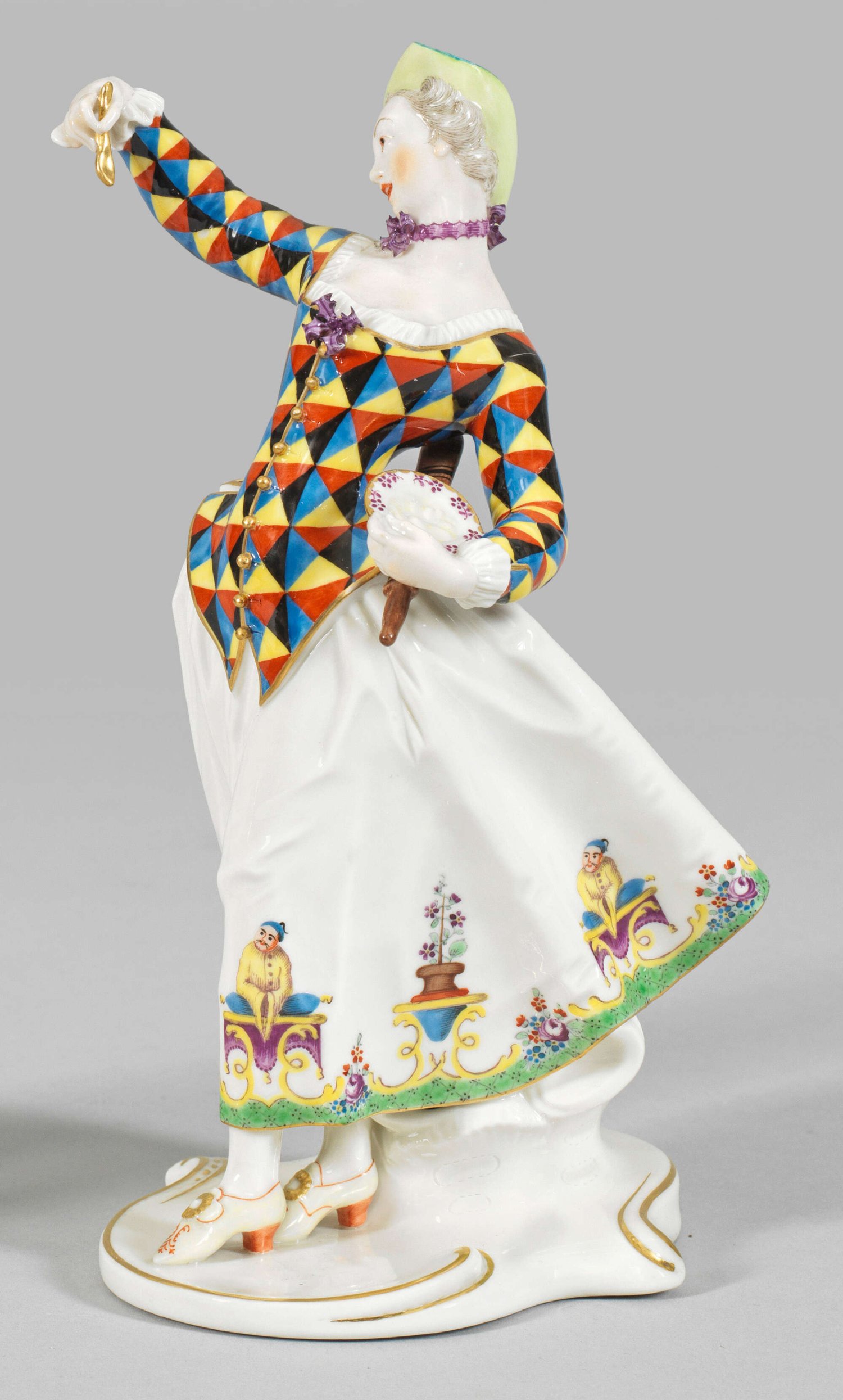 "Lalage" aus der Italienischen Komödie Gegenstück zu "Mezzetino mit Affenbaby". Auf Rocaillesockel stehende junge Komödiantin in kariert gemusterter Jacke und weißem Rock mit umlaufender Bordüre aus Chinoiserie-Motiven, in der linken Hand einen Breiteller, in der Rechten einen Löffel haltend. Polychrome Malerei mit Goldstaffage. Entw. Franz Anton Bustelli, 1759/1760. Manufakturmarke. H. 20,5 cm.