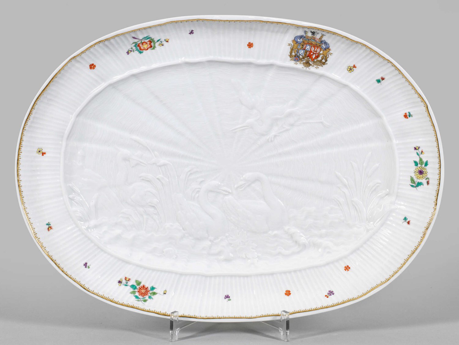 Große ovale Anbietplatte mit Schwanenservice-Dekor Im vertieften Spiegel feiner Reliefdekor aus zwei einander zugeneigten Schwänen sowie fliegendem und zwischen hohem Schilf stehendem Reiher. Auf der gerippten, ansteigenden Fahne Indianischer Blütendekor sowie Allianzwappen des Grafen von Brühl und seiner Gemahlin in polychromer Malerei. Gekämmte Goldkante und -staffage. Entw. Johann Joachim Kaendler und Johann Friedrich Eberlein. Schwertermarke. 46 cm x 33 cm.