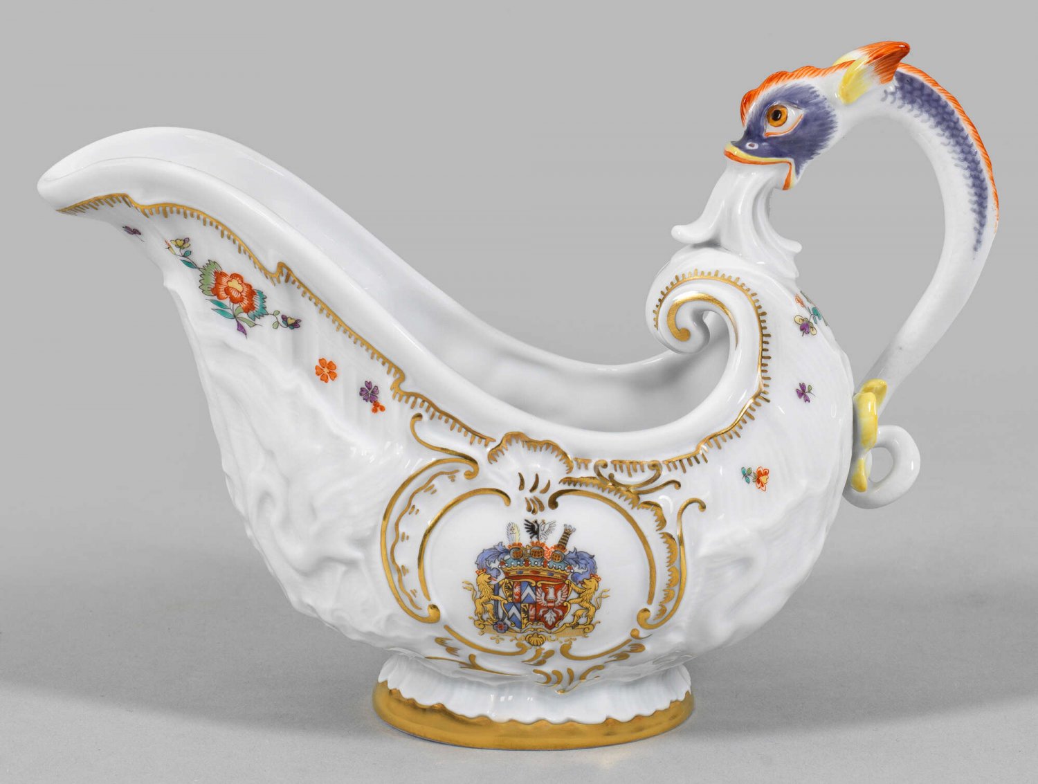Sauciere mit Schwanenservice-Dekor Navettenförmiger, volutierter Korpus mit figürlichem Henkel in Gestalt eines Delphins. Auf der Wandung feiner Reliefdekor aus zwei einander zugeneigten Schwänen, fliegendem und zwischen hohem Schilf stehendem Reiher. Farbiger Indianischer Blütendekor sowie schauseitiges, kartuschengerahmtes Allianzwappen des Grafen von Brühl und seiner Gemahlin in polychromer Malerei. Gekämmte Goldkante und -staffage. Entw. Johann Joachim Kaendler und Johann Friedrich Eberlein. Schwertermarke. H. 14 cm.