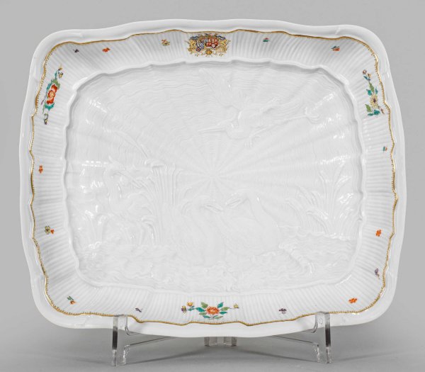 Anbietschale mit Schwanenservice-Dekor Rechteckige, gemuldete Form. Feiner Reliefdekor aus zwei einander zugeneigten Schwänen und Reihern zwischen Schilf. Auf dem gerippten, ansteigenden Rand Indianischer Blütendekor sowie Allianzwappen des Grafen von Brühl und seiner Gemahlin in polychromer Malerei. Gekämmte Goldkante und -staffage. Entw. Johann Joachim Kaendler und Johann Friedrich Eberlein. Schwertermarke. 25 cm x 20 cm.