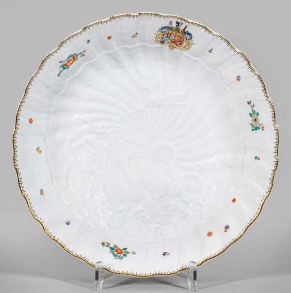 Große Anbietschale mit Schwanenservice-Dekor Runde, gemuldete Form. Im Spiegel feiner Reliefdekor aus zwei einander zugeneigten Schwänen sowie fliegendem und zwischen hohem Schilf stehendem Reiher. Auf dem gerippten, ansteigendem Rand Indianischer Blütendekor sowie Allianzwappen des Grafen von Brühl und seiner Gemahlin in polychromer Malerei. Gekämmte Goldkante und -staffage. Entw. Johann Joachim Kaendler und Johann Friedrich Eberlein. Schwertermarke. D. 30 cm.
