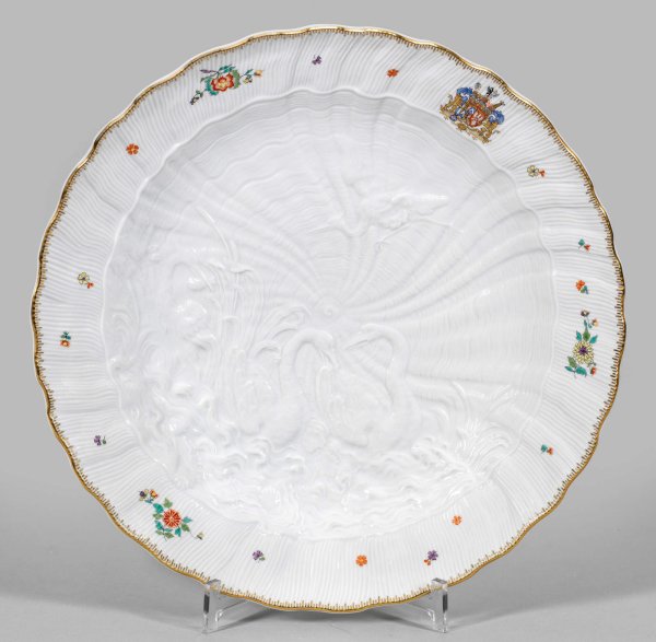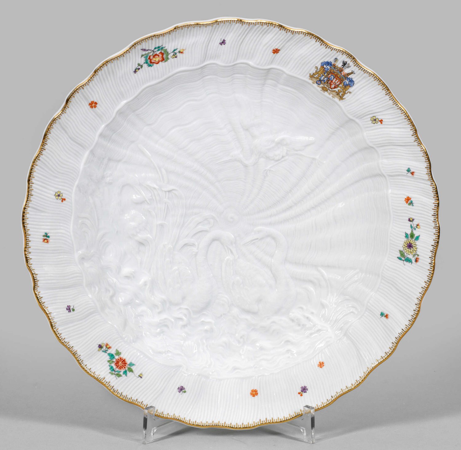 Große Anbietschale mit Schwanenservice-Dekor Runde Form. Im vertieften Spiegel feiner Reliefdekor aus zwei einander zugeneigten Schwänen sowie fliegendem und zwischen hohem Schilf stehendem Reiher. Auf der gerippten, ansteigenden Fahne Indianischer Blütendekor sowie Allianzwappen des Grafen von Brühl und seiner Gemahlin in polychromer Malerei. Gekämmte Goldkante und -staffage. Entw. Johann Joachim Kaendler und Johann Friedrich Eberlein. Schwertermarke. D. 35 cm.