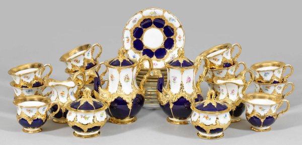 Mokkaservice mit kobaltblauem Fond und Blumendekor 18-tlg.; 2 Mokkakanne, 2 Zuckerdosen, 2 Sahnegießer, 12 Tassen mit Untertassen. Bombierte Form mit c-förmig geschwungenen Volutenhenkeln. Auf der Wandung und im Spiegel prächtiger Dekor aus goldstaffierten, reliefierten Rocaillebordüren als Rahmung für kobaltblaue bzw. weiße Fondflächen mit Streublumen in polychromer Malerei. Minim. best./rep.; Schwertermarke. Kannen-H. 19 cm.