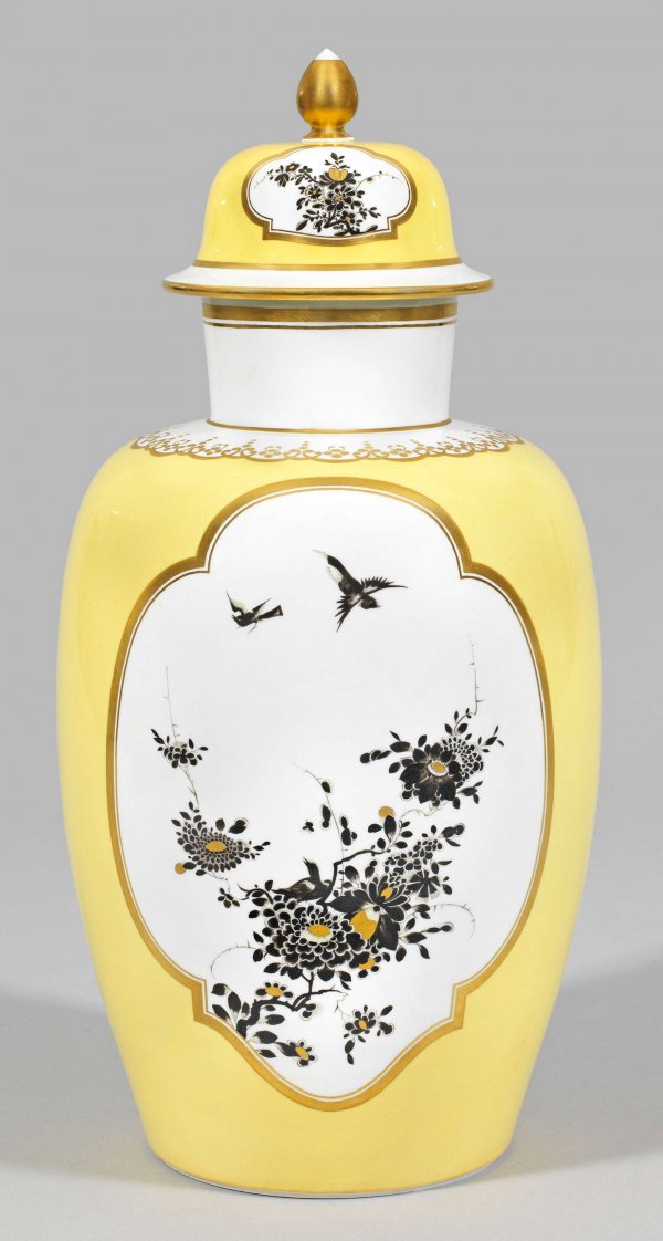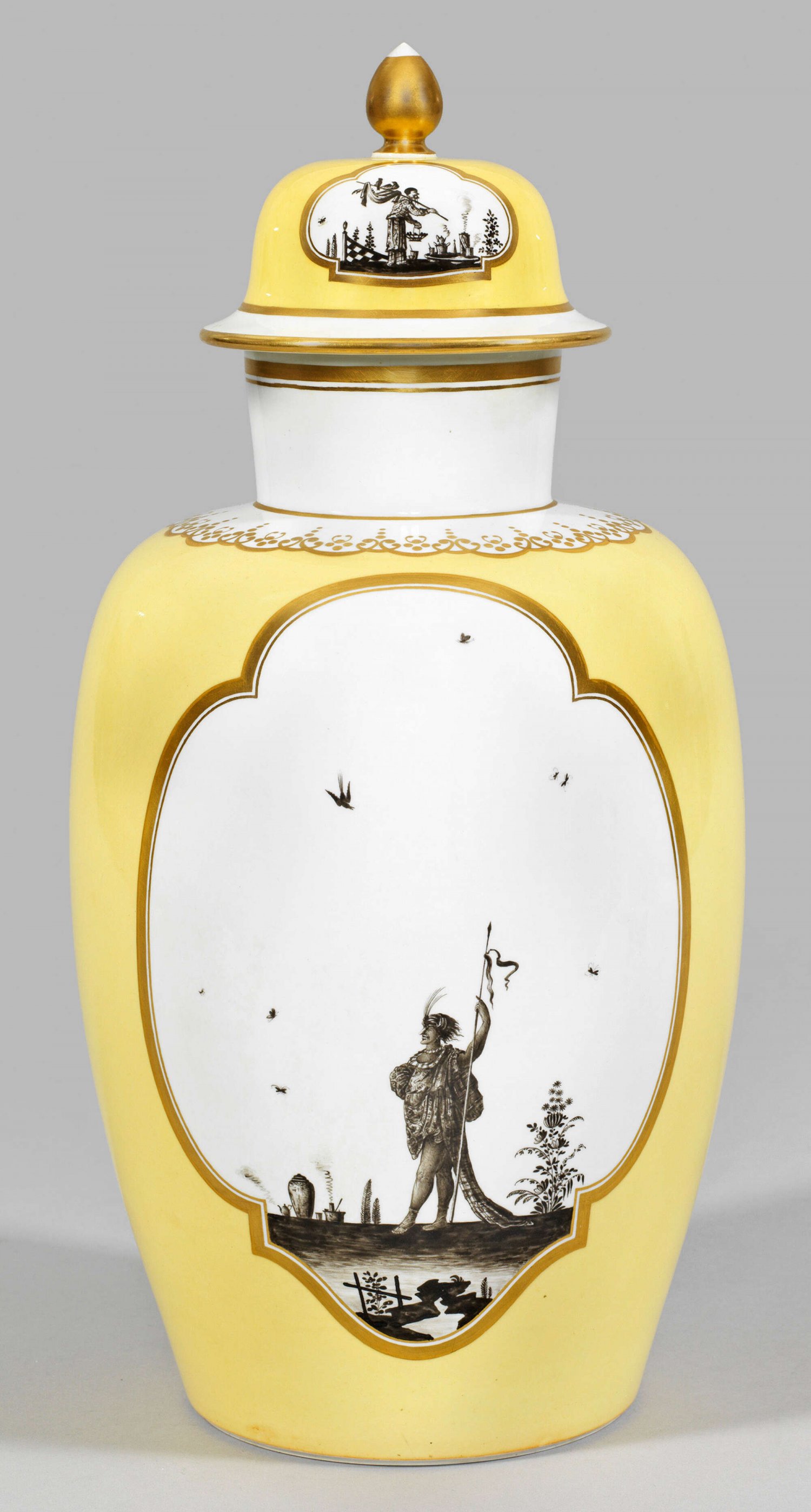 Balusterförmiger Korpus mit haubenartig aufgewölbtem Deckel, mittig stilisierter Pinienknauf. Beidseitig der Wandung und auf dem Deckel, in zitronengelbem Fond passig ausgesparte, goldgerahmte Reserven. Auf der Schauseite szenische Darstellung eines indianischen Kriegers zwischen Blütenstaude und Porzellangefäßen bzw. eines Chinesen in Parklandschaft, umgeben von fliegenden Vögeln und Insekten. Rückseitig großes Bukett aus Indianischen Blumen. Teilw. in Gold gehöhte Sepiamalerei. Umlaufend breite Goldspitzenbordüre auf weißem Fond. Minim. rest.; "Augustus Rex" - Sondermarke mit Dat. 1928 in Unterglasurblau.