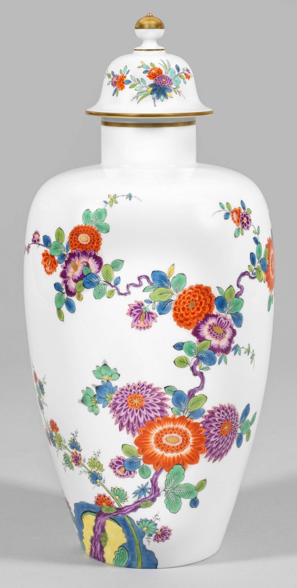 Große Deckelvase mit Kakiemondekor Balusterförmiger Korpus mit aufgewölbtem, überkragendem Deckel, mittig Kugelknauf. Auf der Wandung großflächiger, stilisierter Indianischer Blumendekor aus blühenden Päonien- und Chrysanthemenzweigen. Polychrome, teilw. in Gold gehöhte Malerei im Kakiemonstil. Goldstaffage. Schwertermarke. H. 46 cm.