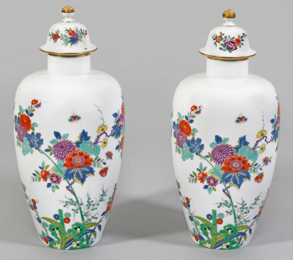Paar große Deckelvasen mit Kakiemondekor Balusterförmiger Korpus mit haubenartig aufgewölbtem, überkragendem Deckel, mittig kugelförmiger Knauf. Auf der Wandung großflächiger, stilisierter Indianischer Blumendekor aus blühenden Päonien- und Chrysanthemenzweigen sowie Bambus und Pinienästen, umgeben von farbenprächtigem Schmetterling und Phönix. Polychrome, teilw. in Gold gehöhte Malerei im Kakiemonstil. Goldstaffage. Ein Deckel rest.; Schwertermarke. H. 45,5 cm.