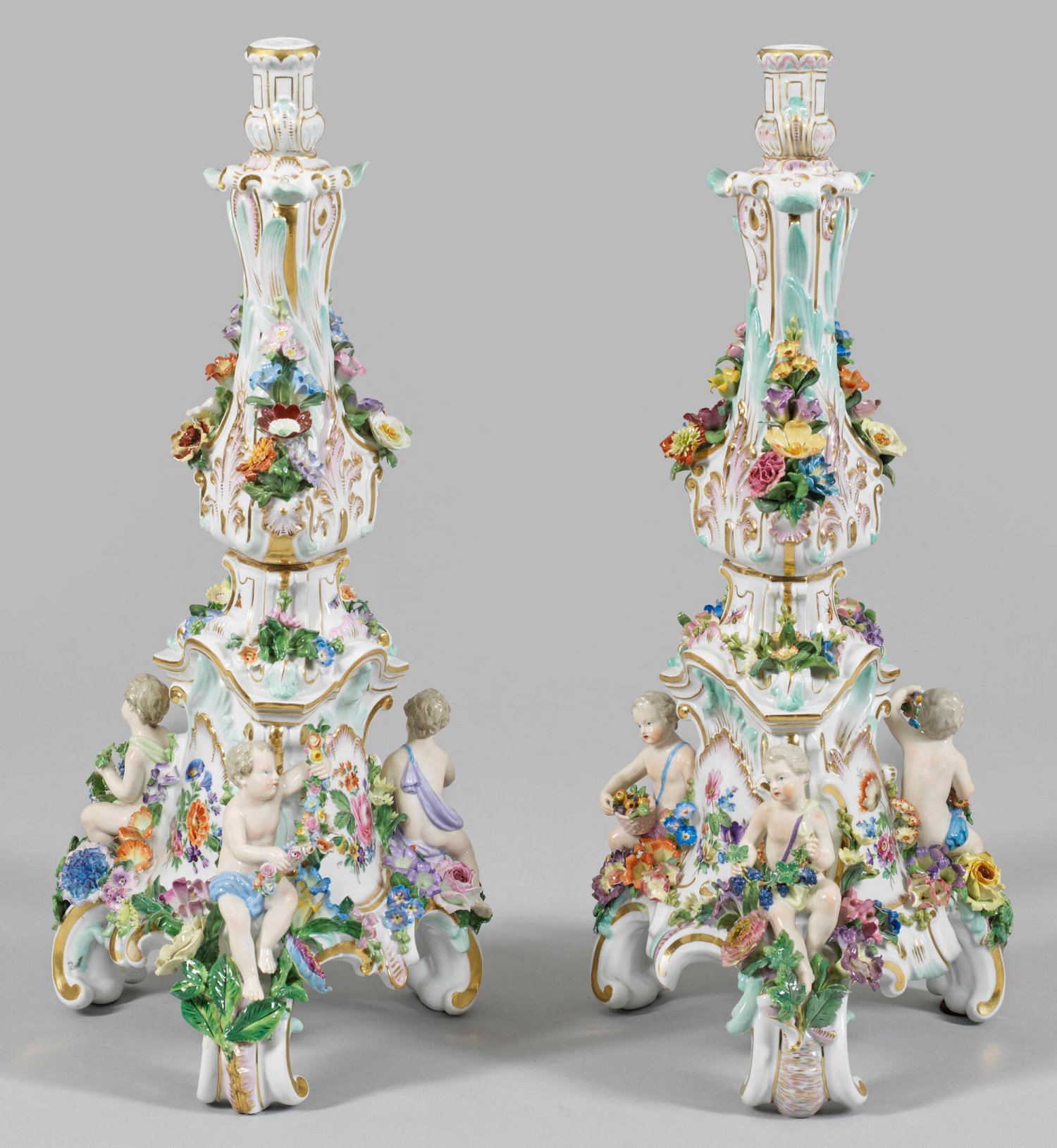 Paar Figurenleuchter 1-flg.; Hoher Volutensockel mit sitzenden Putten, Blumengirlanden bzw. Fruchtkörbe haltend. Blattreliefierter, architektonisch gegliederter Balusterschaft, übergehend in kelchförmige Tülle. Auf der Wandung reicher Dekor aus plastisch aufgelegten Blüten, Blumenbuketts und Insekten. Polychrome Malerei mit Goldstaffage. Entw. Ernst August Leuteritz. Unw. rest.; Schwertermarke. H. 46,5 cm.
