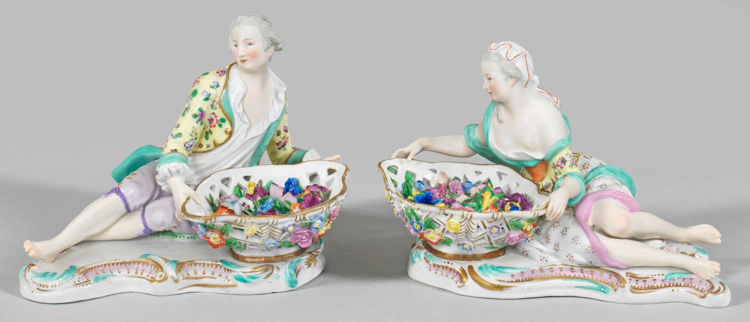 Dame und Kavalier mit Blumenschale Auf rocaillengerahmtem Sockel liegende Dame bzw. junger Kavalier, mit beiden Händen eine ovale, mit plastischen Blüten gefüllte Schale haltend. Polychrome Malerei mit Goldkonturierung. Rest.; Schwertermarke. H. 11 cm - 11,5 cm. 17 cm x 10 cm - 13 cm.