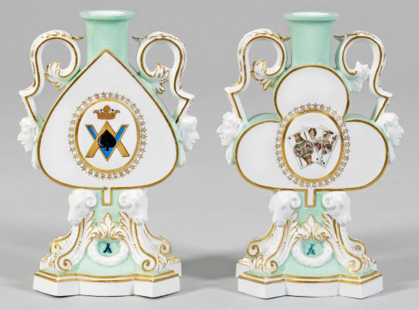 Paar Tischleuchter Aufsteigender Sockel, oberhalb in plastischen Widderkopf endend. Pik-bzw. Kreuzförmiger Korpus nach Spielkartenmotiven, flankiert von geschweiften Blattvolutenhenkeln mit Maskaronansatz, teilw. seegrün staffiert. Beidseitig der Wandung, in ovalem, goldornamentiertem Medaillon gerahmtes, bekröntes Emblem der Familie Litchfield bzw. Spielkartendekor. Polychrome Malerei mit Goldstaffage. Im Boden bez. "(...)angefertigt für S. Litchfield in London."; Schwertermarke. H. 18 cm.