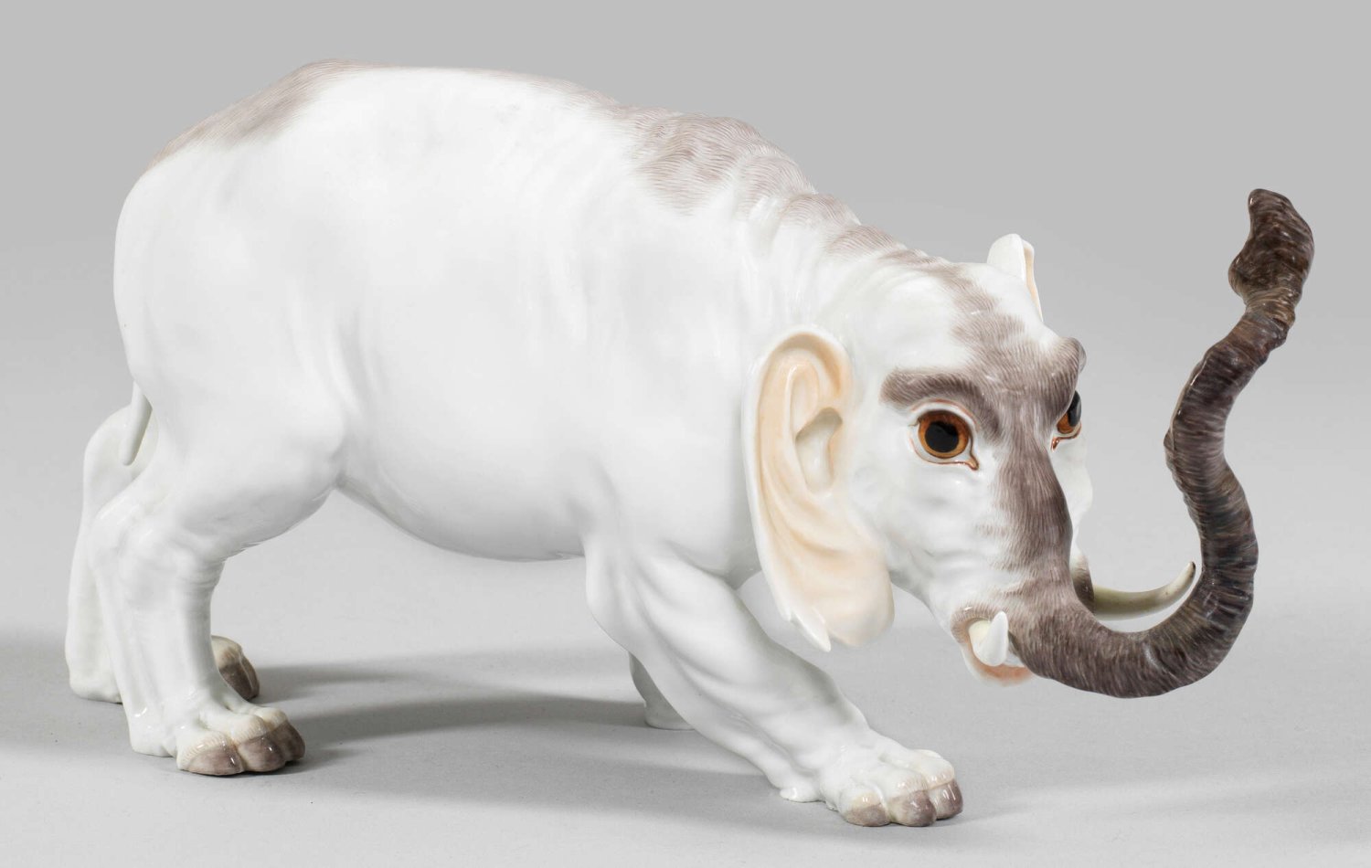 Elefant aus der Kollektion "Limitierte Meisterwerke" Nach rechts stehender Elefant mit erhobenem Rüssel. Naturalistisch, hellgrau staffiert. Polychrome, sparsame Malerei. Entw. Johann Joachim Kaendler und Peter Reinicke. Modell-Nr. 78956. Limitierte Auflage 047/100. Jahreszeichen. Schwertermarke mit Goldsignet. H. 12 cm. 25 cm x 9 cm.