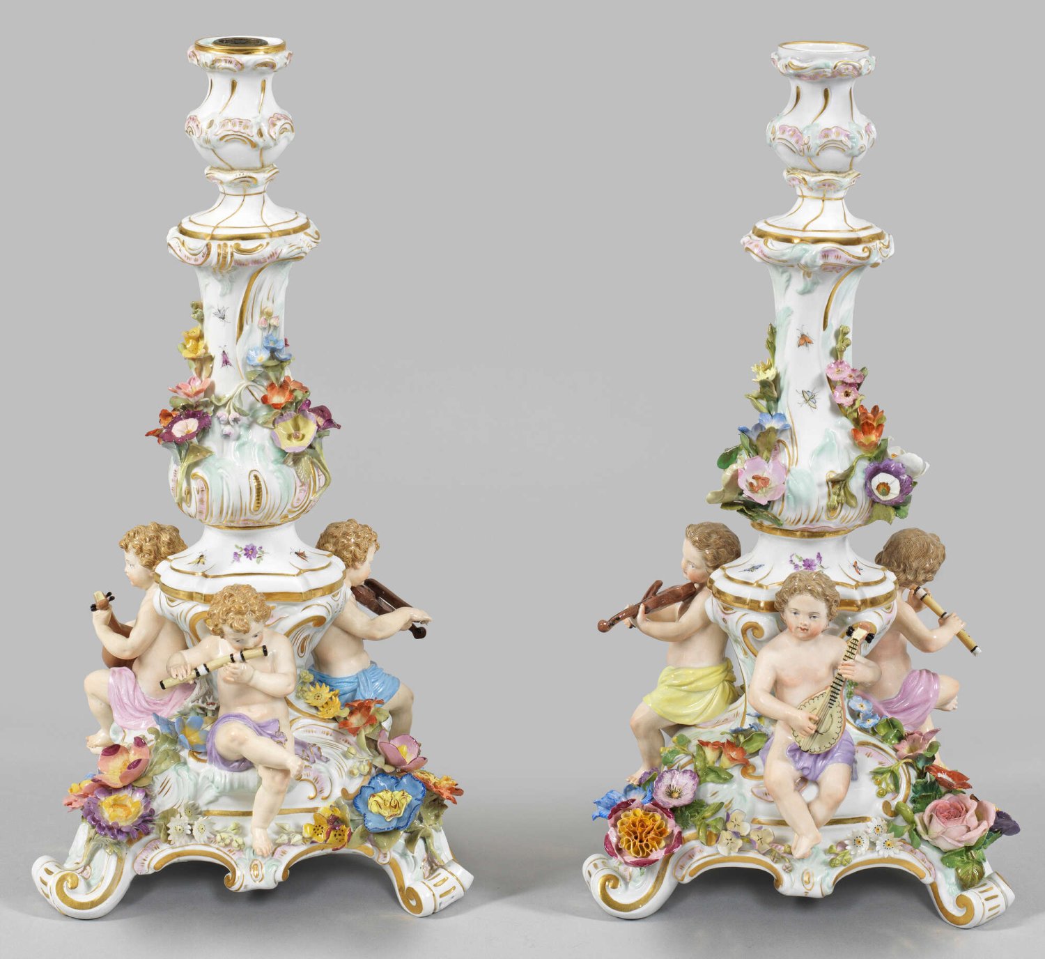 Paar Figurenleuchter 1-flg.; Von Voluten getragener, dreiseitig geschweifter Sockel, in Balusterschaft mit vasenförmiger Tülle übergehend. Unterhalb sitzende, musizierende Putten mit Laute, Violine bzw. Querflöte. Umlaufend plastisch aufgelegte Blüten sowie feiner Streublumen- und Insektendekor. Polychrome Malerei mit Goldstaffage. Unw. rest.; Schwertermarke. H. 38,5 cm – 39 cm.