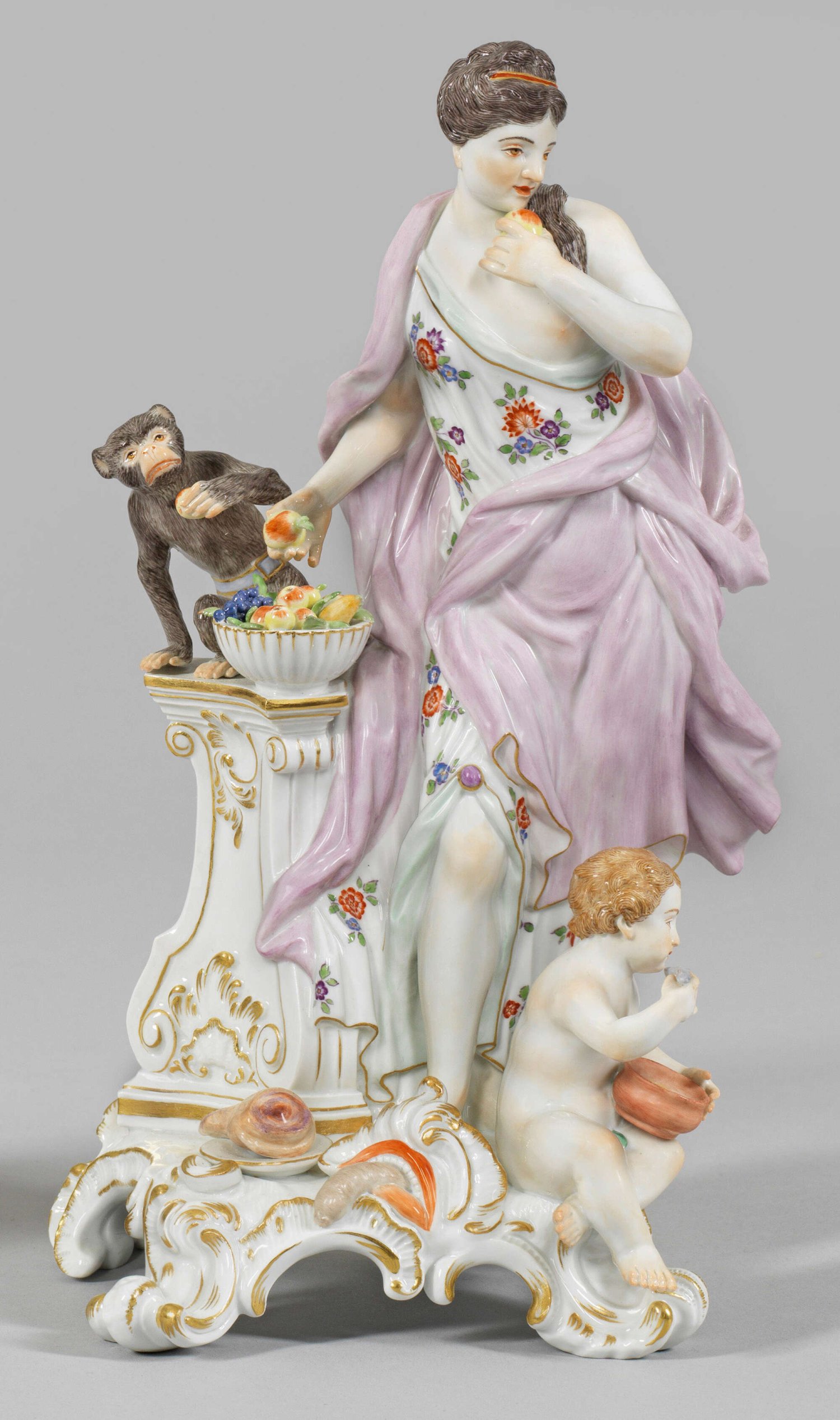 Allegorische Figur "Der Geschmack". Originaltitel aus der Serie "Fünf Sinne". Auf reliefiertem Volutensockel stehende junge Dame im antikisierenden, blumengemusterten Gewand mit rosafarbenem Umhang, in beiden Händen jeweils einen Apfel haltend. Seitlich sitzender Affe auf hohem Podestsockel, sich aus der gefüllten Obstschale bedienend. Zu ihren Füßen ein Teller mit Schinkenkeule bzw. ein sitzender Knabe, eine Suppe löffelnd. Polychrome Malerei mit Goldstaffage. Entw. Johann Friedrich Eberlein. Schwertermarke. H. 29,5 cm.