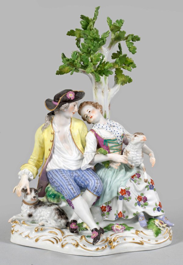 Schäfergruppe Rocailleförmig reliefierter, mit plastischen Blüten und Blättern belegter Sockel. Unter einem Baum innig beieinander sitzendes, sich an den Händen berührendes, junges Schäferpaar in sommerlicher Kleidung. Seitlich auf ihrem Schoß sitzendes Lamm bzw. zu seinen Füßen ruhender Hund. Polychrome Malerei mit Goldkonturierung. Entw. Johann Joachim Kaendler. Rest.; Minim. best.; Schwertermarke. H. 24,5 cm. 18 cm x 18 cm.
